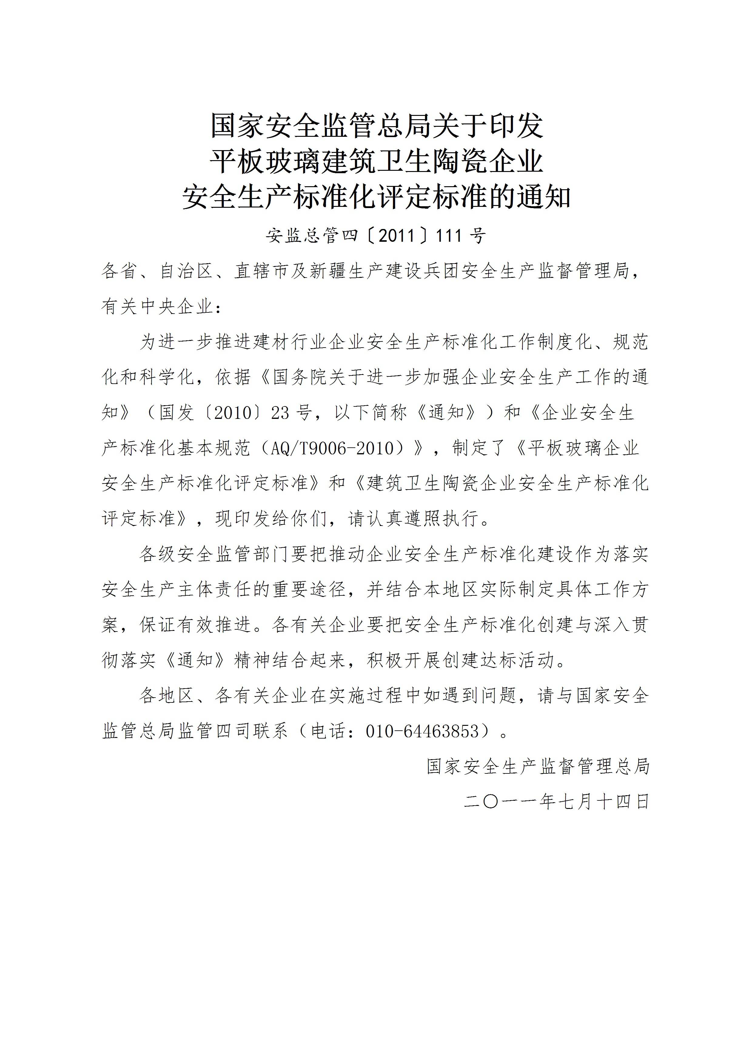 安监总管四(2011)111号国家安全监管总局关于印发平板玻璃建筑卫生陶瓷企业安全生产标准化评定标准的通知[文档]