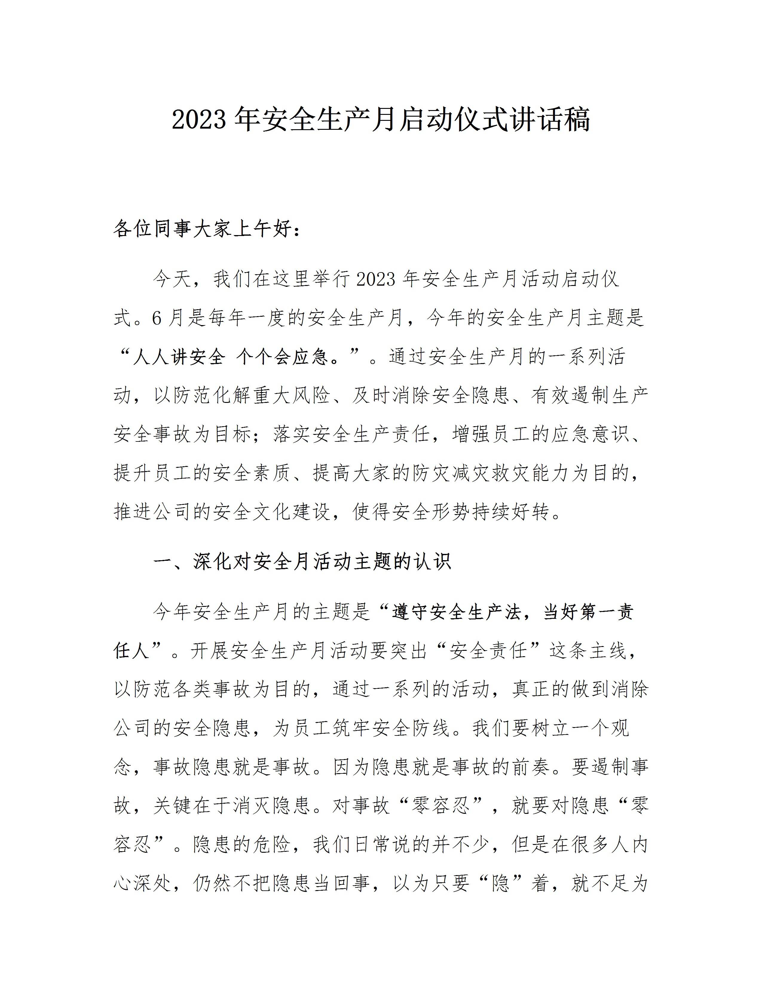 / [讲话]2023年安全生产月启动仪式讲话稿3页[文档]