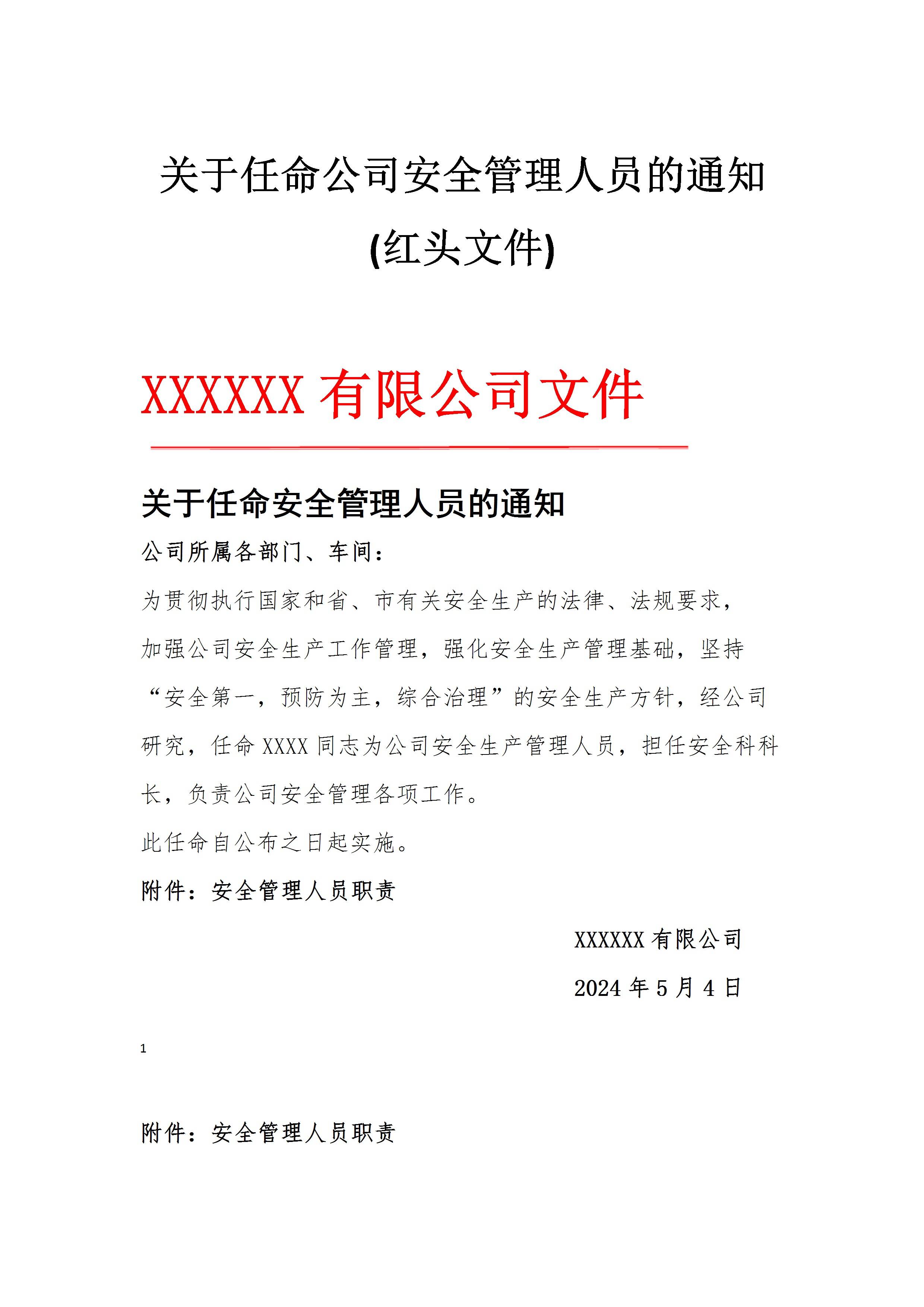 [模板]关于任命公司安全管理人员的通知红头文件[文档]