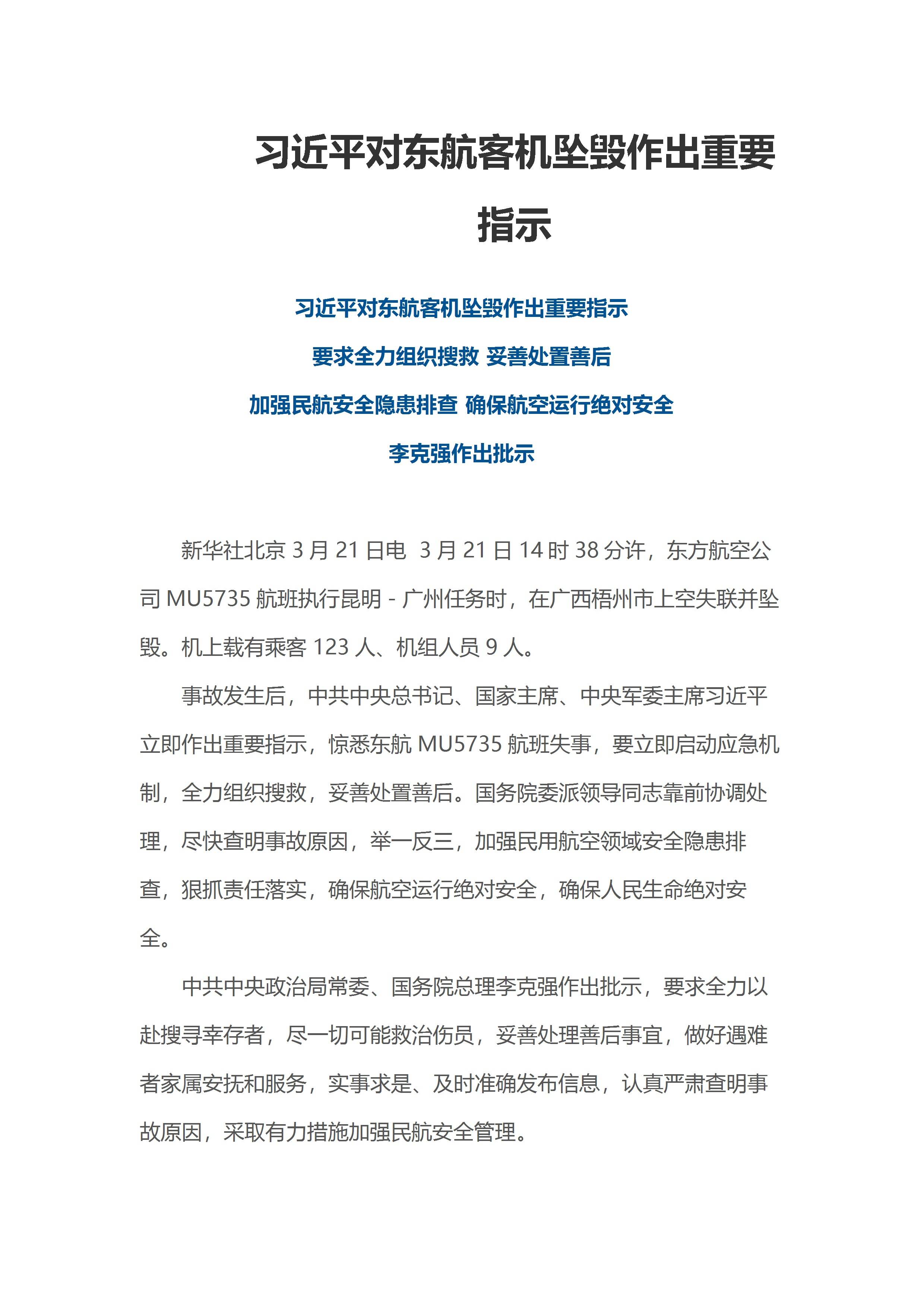 / 2022年3月习近平对东航客机坠毁作出重要指示[文档]