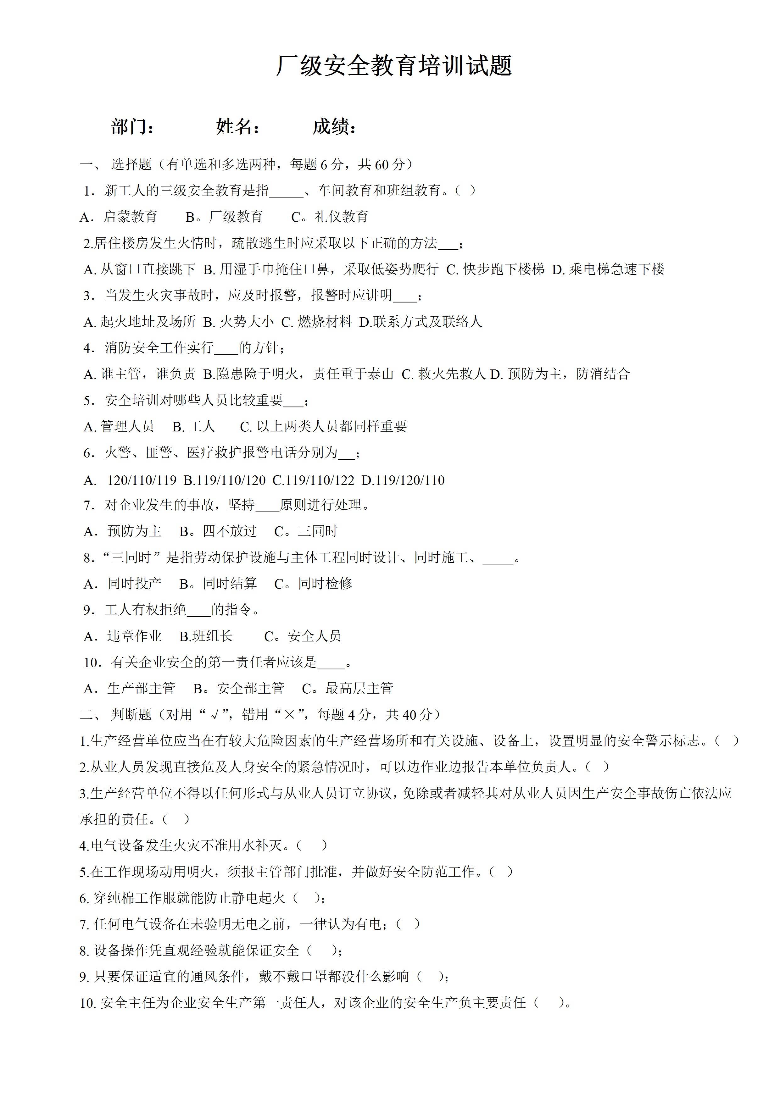 / 公司级安全培训试题及答案 员工每人一份[文档]