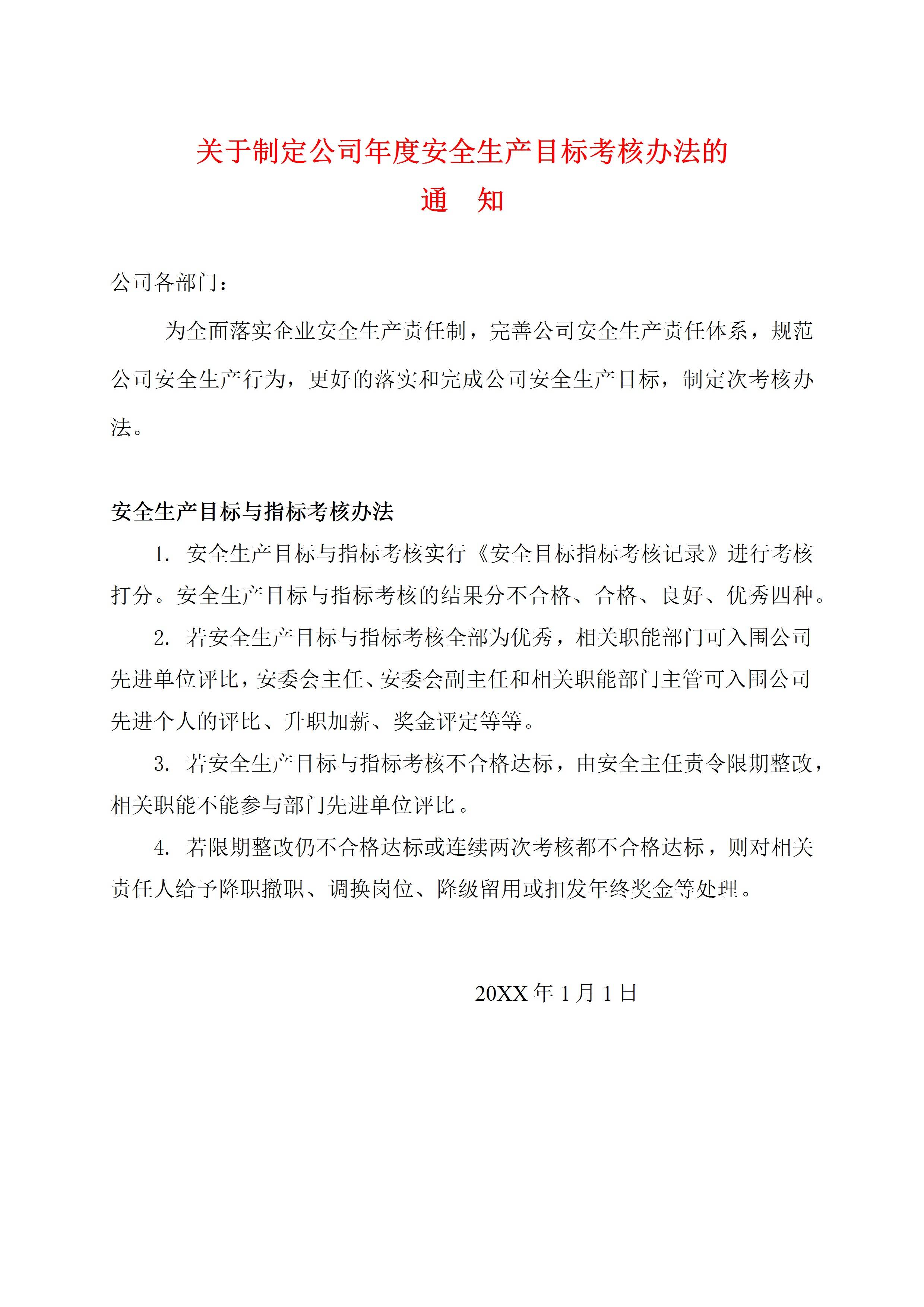 / 关于制定公司年度安全生产目标考核办法的通知[文档]