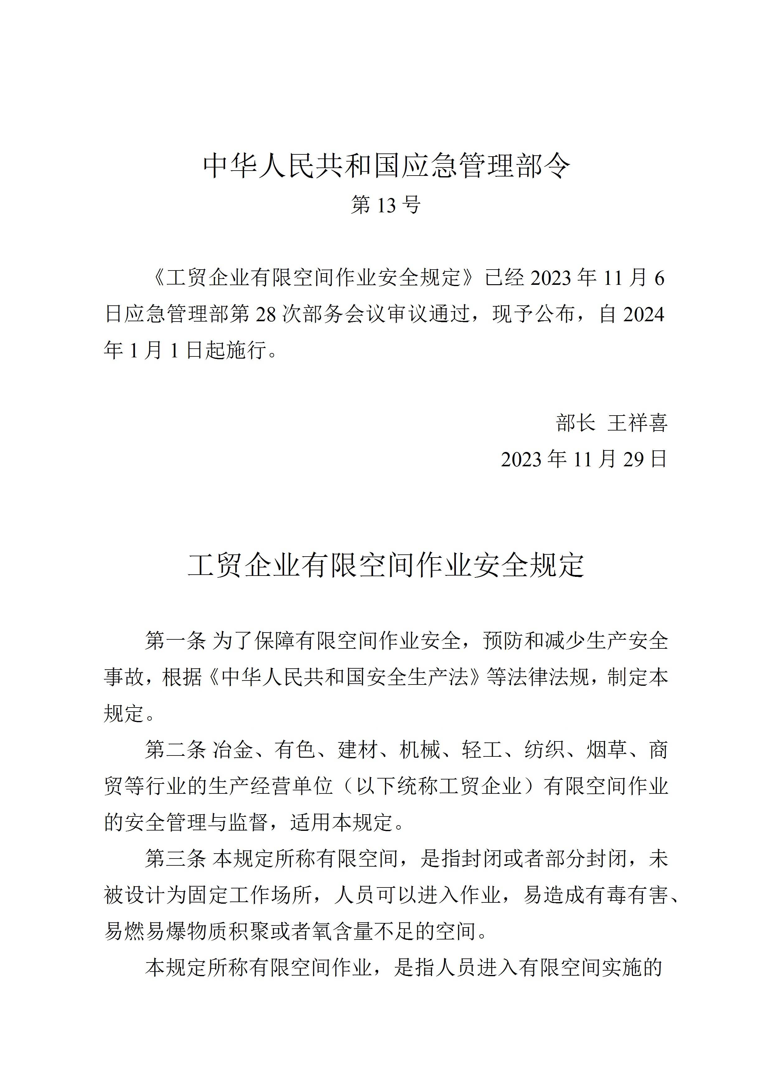 / 工贸企业有限空间作业安全规定 应急管理部令第13号[文档]