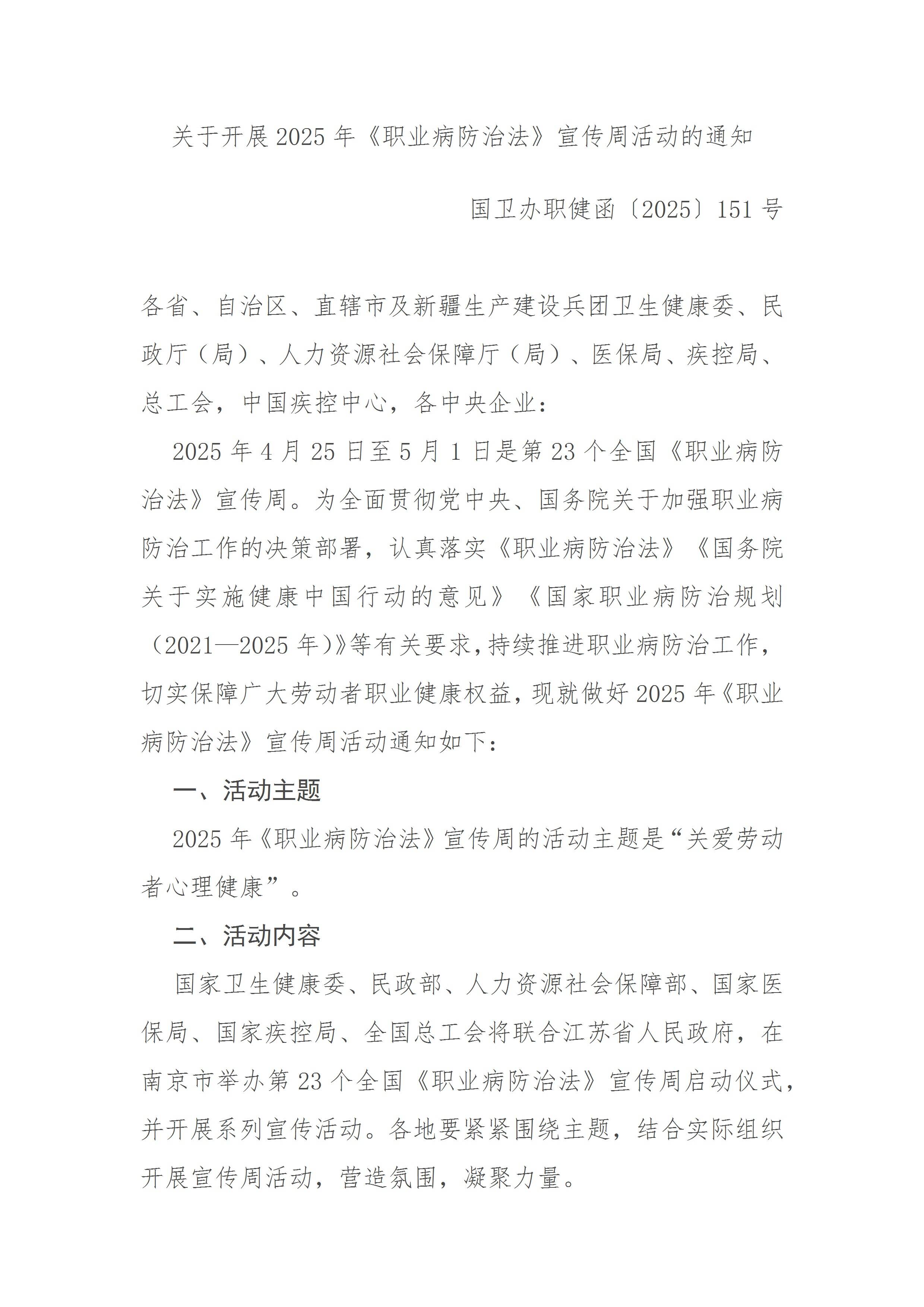 关于开展2025年职业病防治法宣传周活动的通知 国卫办职健函2025151号[文档]