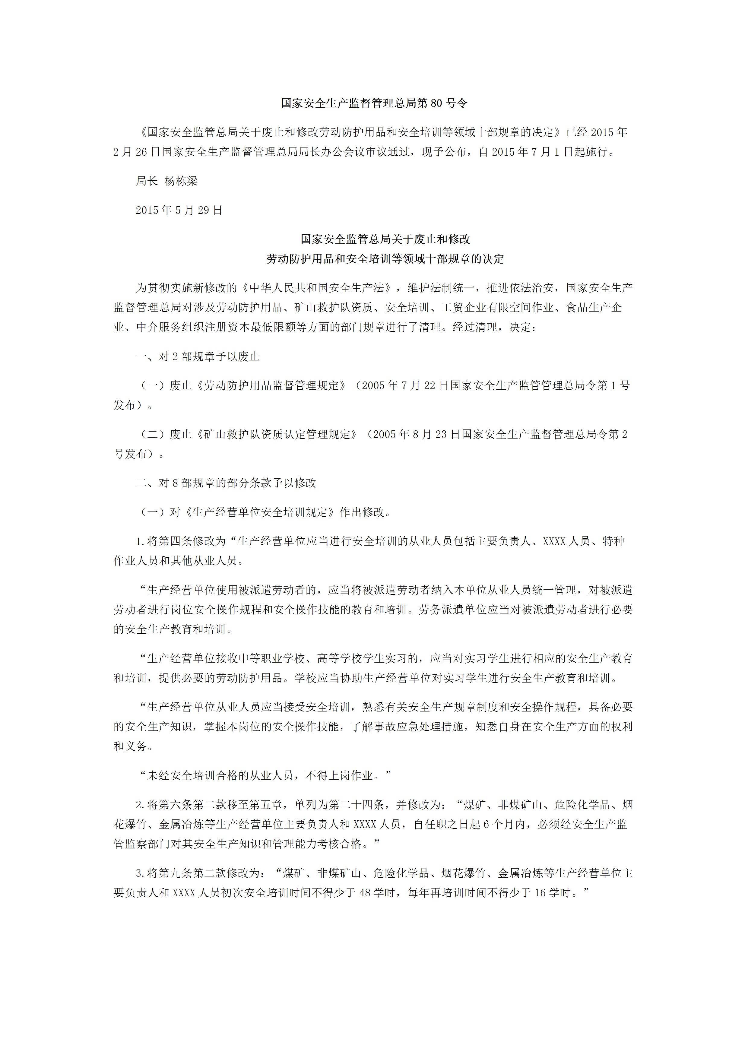 80号令国家安全监管总局关于废止和修改劳动防护用品和安全培训等领域十部规章的决定[文档版]