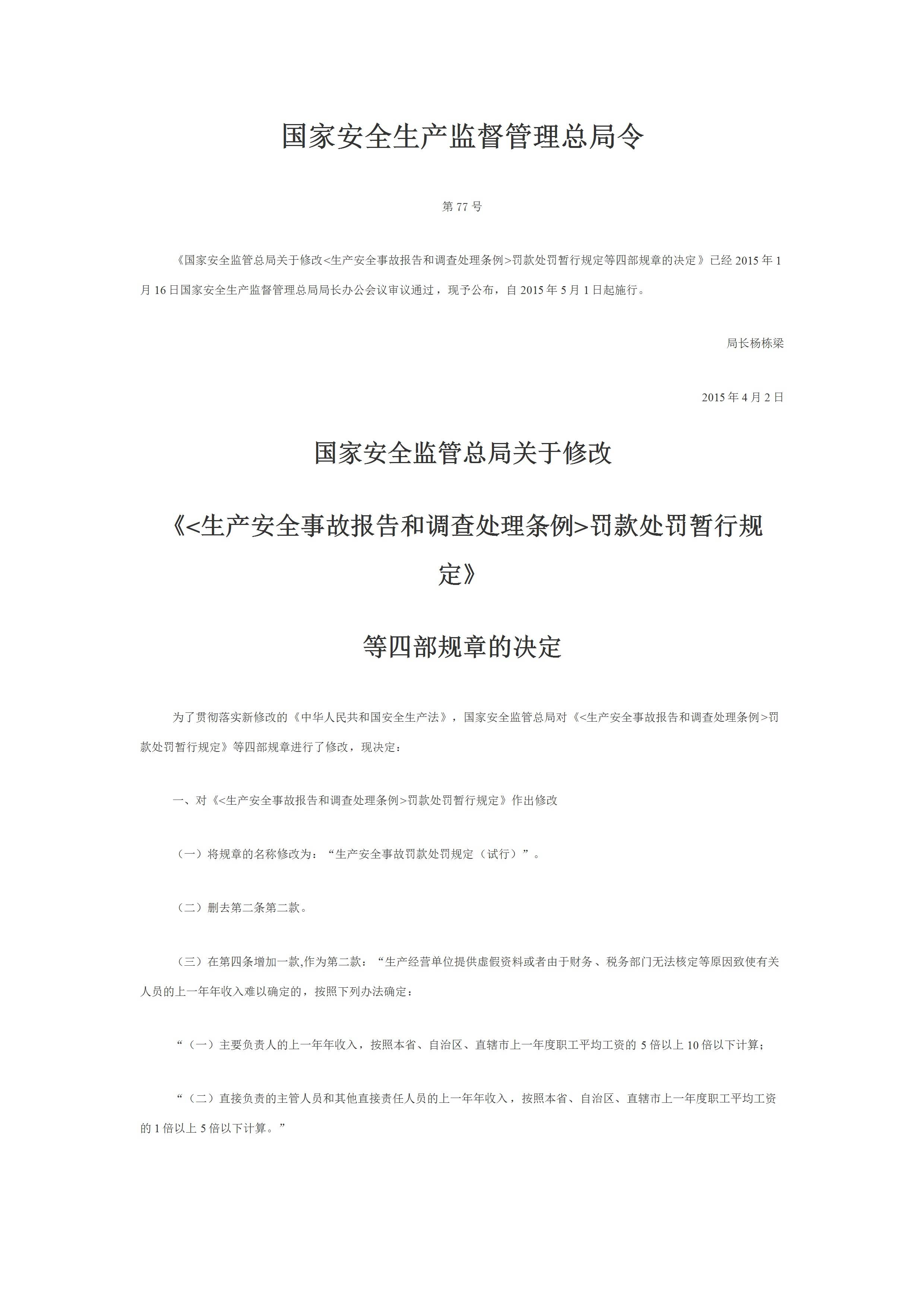 77号令国家安全监管总局关于修改生产安全事故报告和调查处理条例罚款处罚暂行规定[文档版]