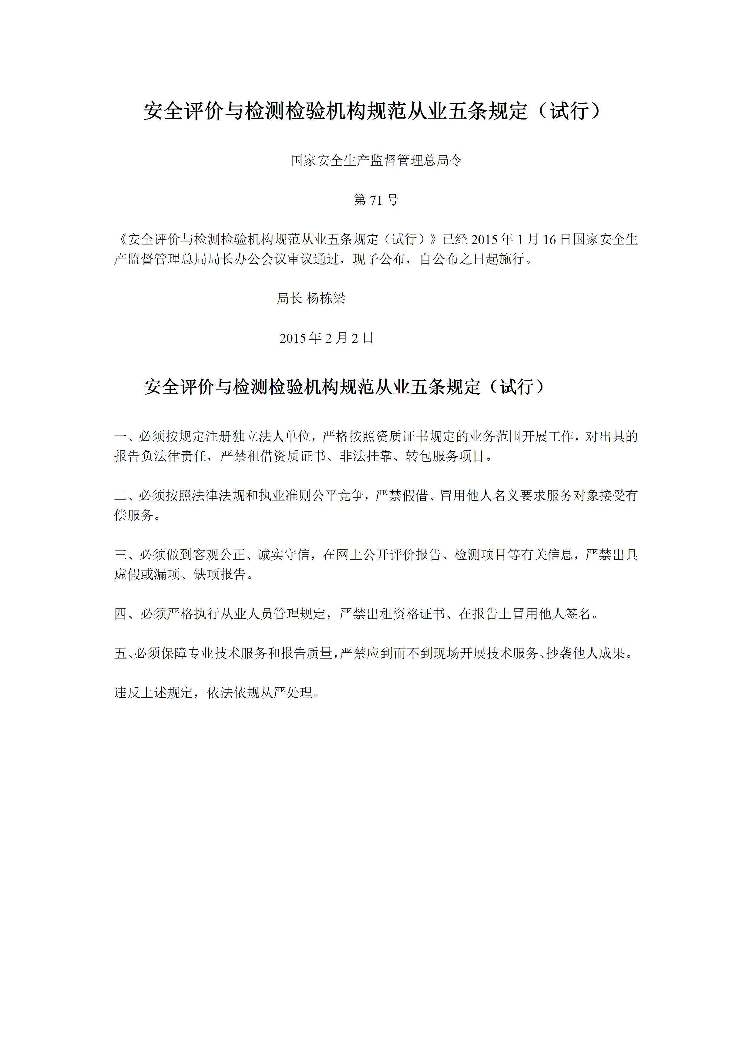 / 71号令安全评价与检测检验机构规范从业五条规定[文档版]