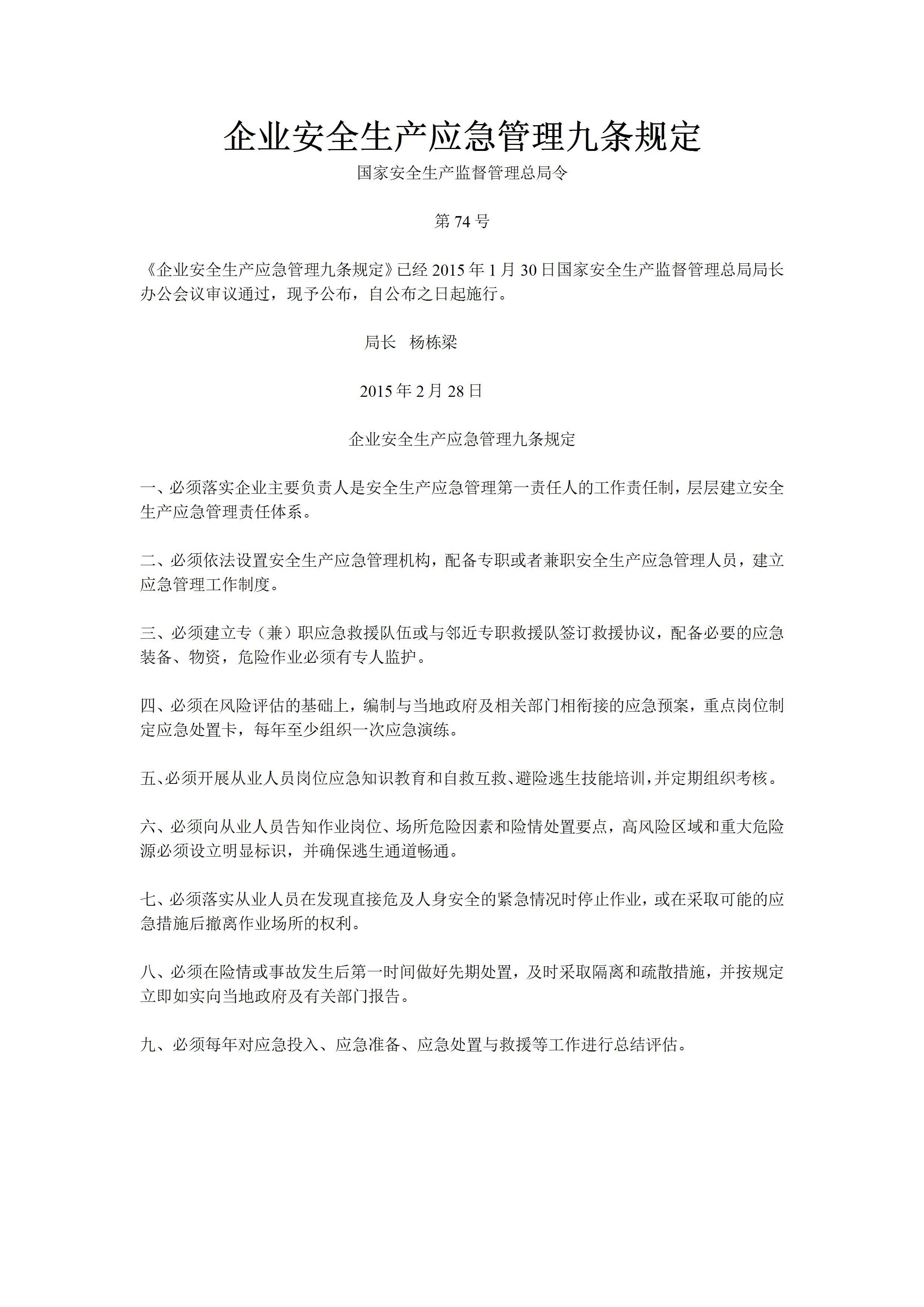 / 74号令企业安全生产应急管理九条规定[文档版]