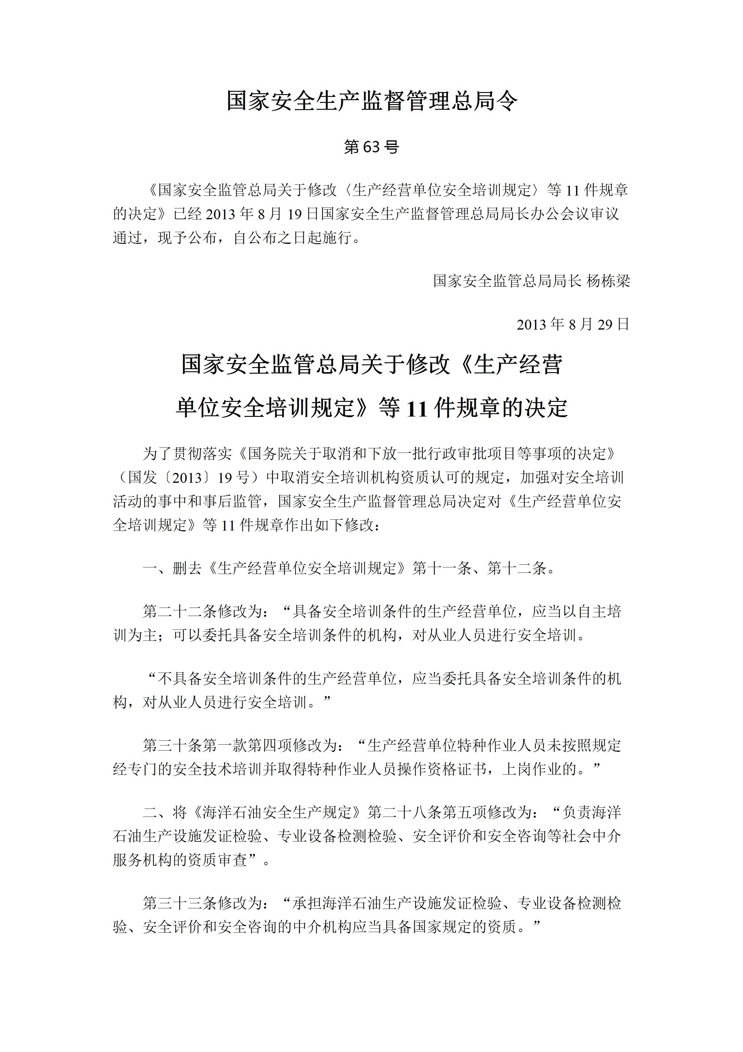 63号令国家安全监管总局关于修改生产经营单位安全培训规定等11件规章的决定[文档版]