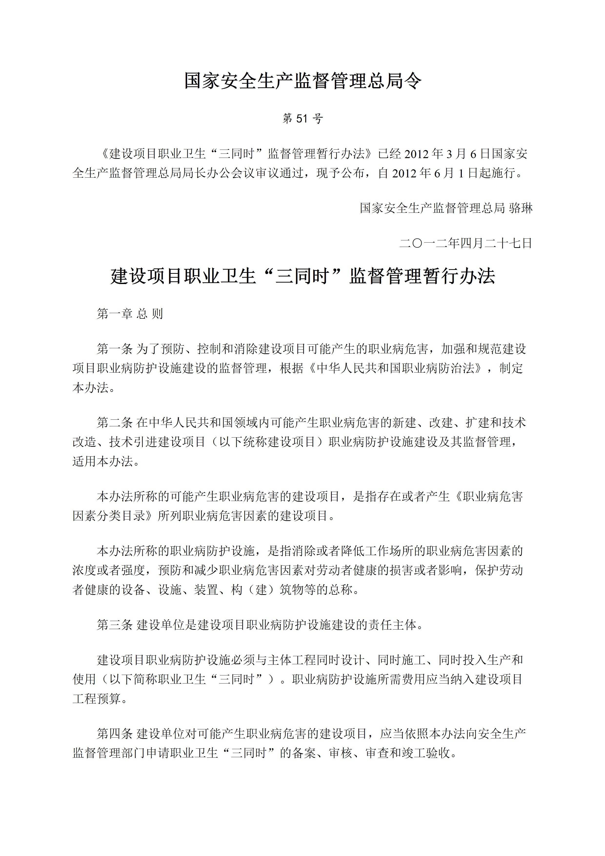 51号令建设项目职业卫生三同时监督管理暂行办法[文档版]
