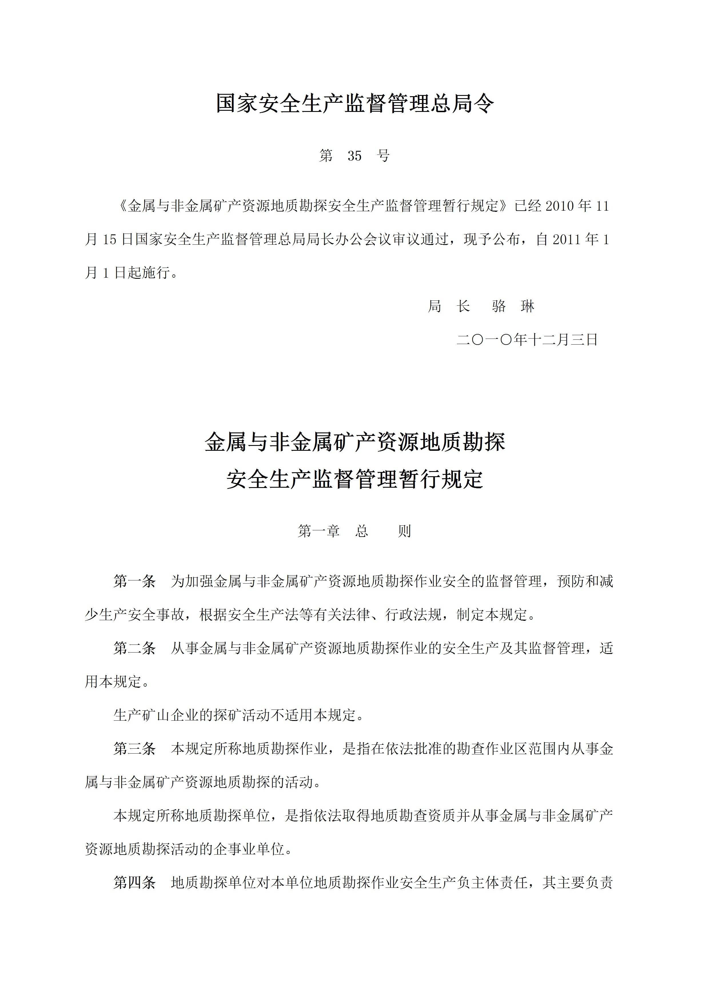 35号令金属与非金属矿产资源地质勘探安全生产监督管理暂行规定[文档版]