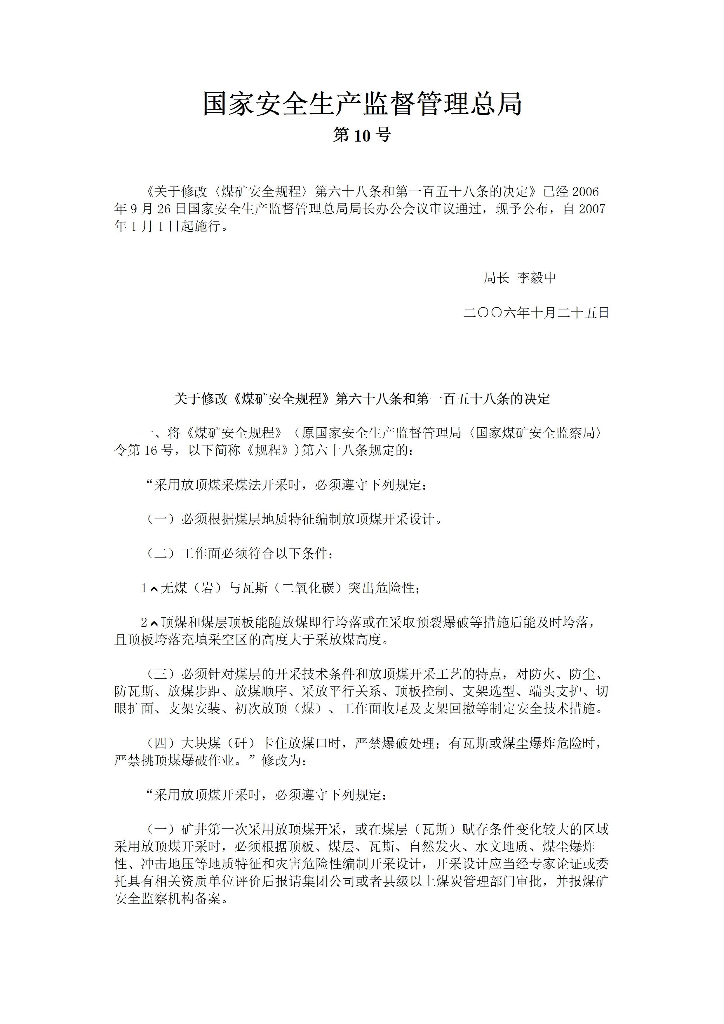 10号令关于修改煤矿安全规程第六十八条和第一百五十八条的决定[文档版]