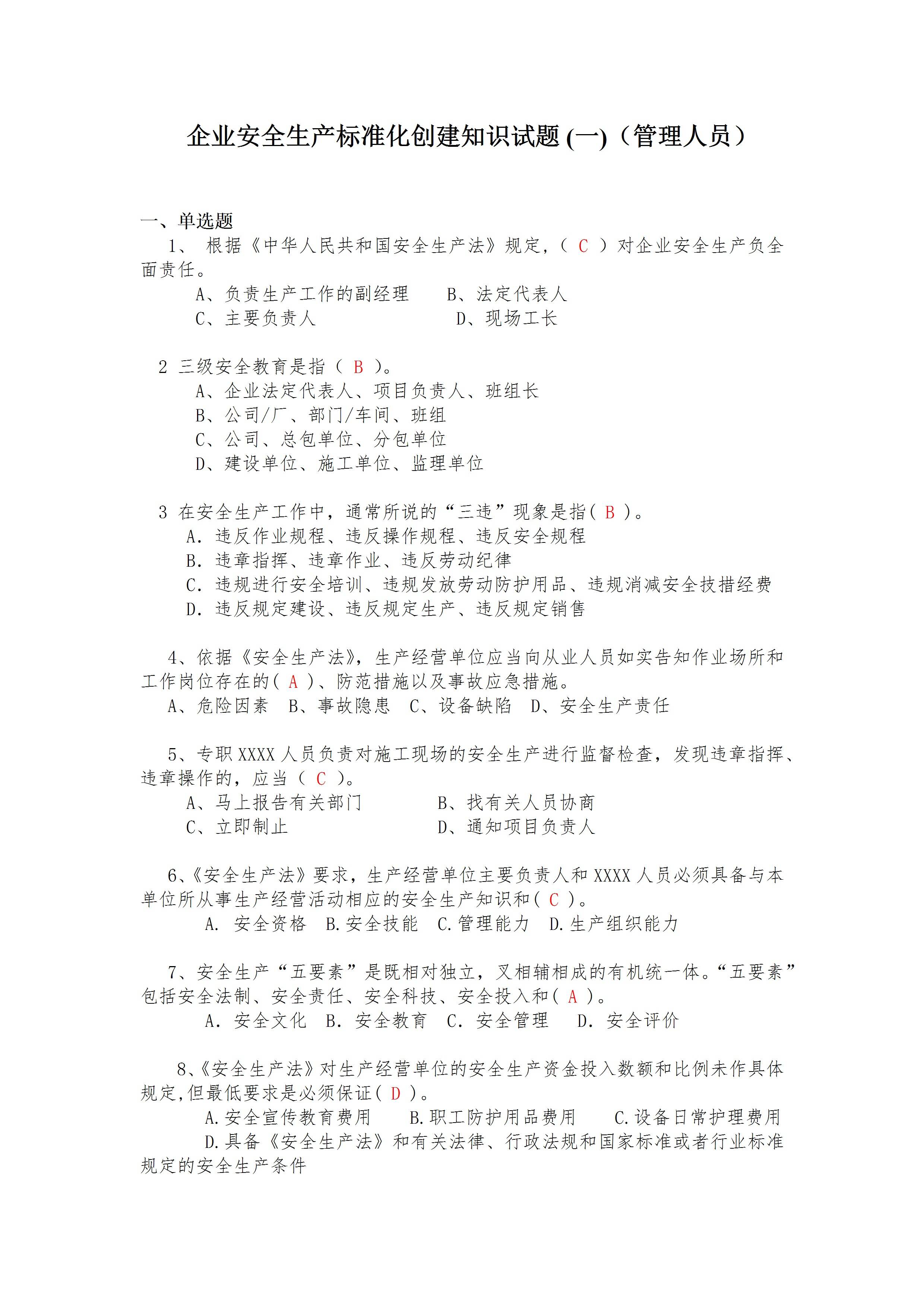 / 安全生产标准化创建知识试题管理人员 [文档版]