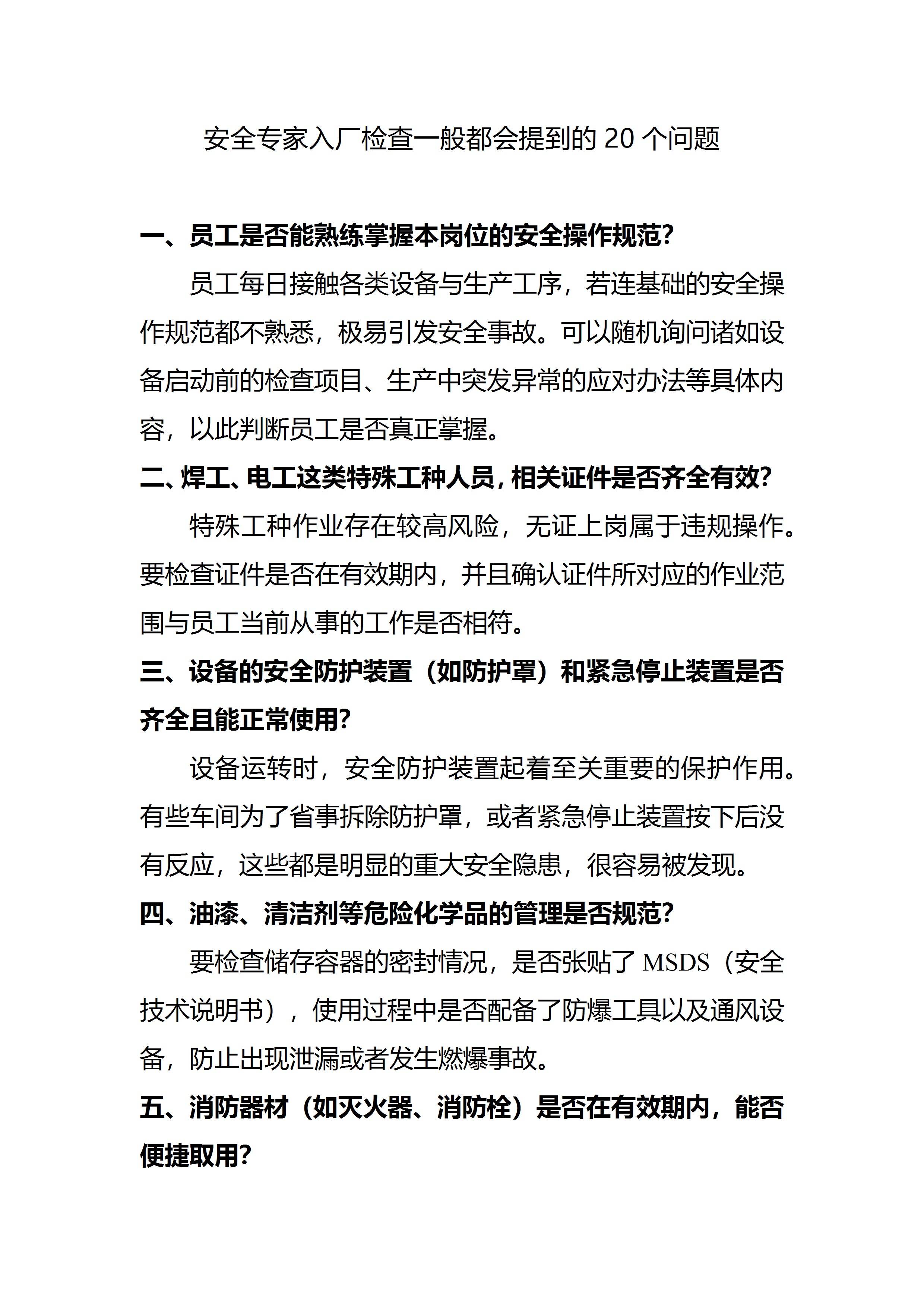 安全专家入厂检查一般都会提到的20个问题[文档版]