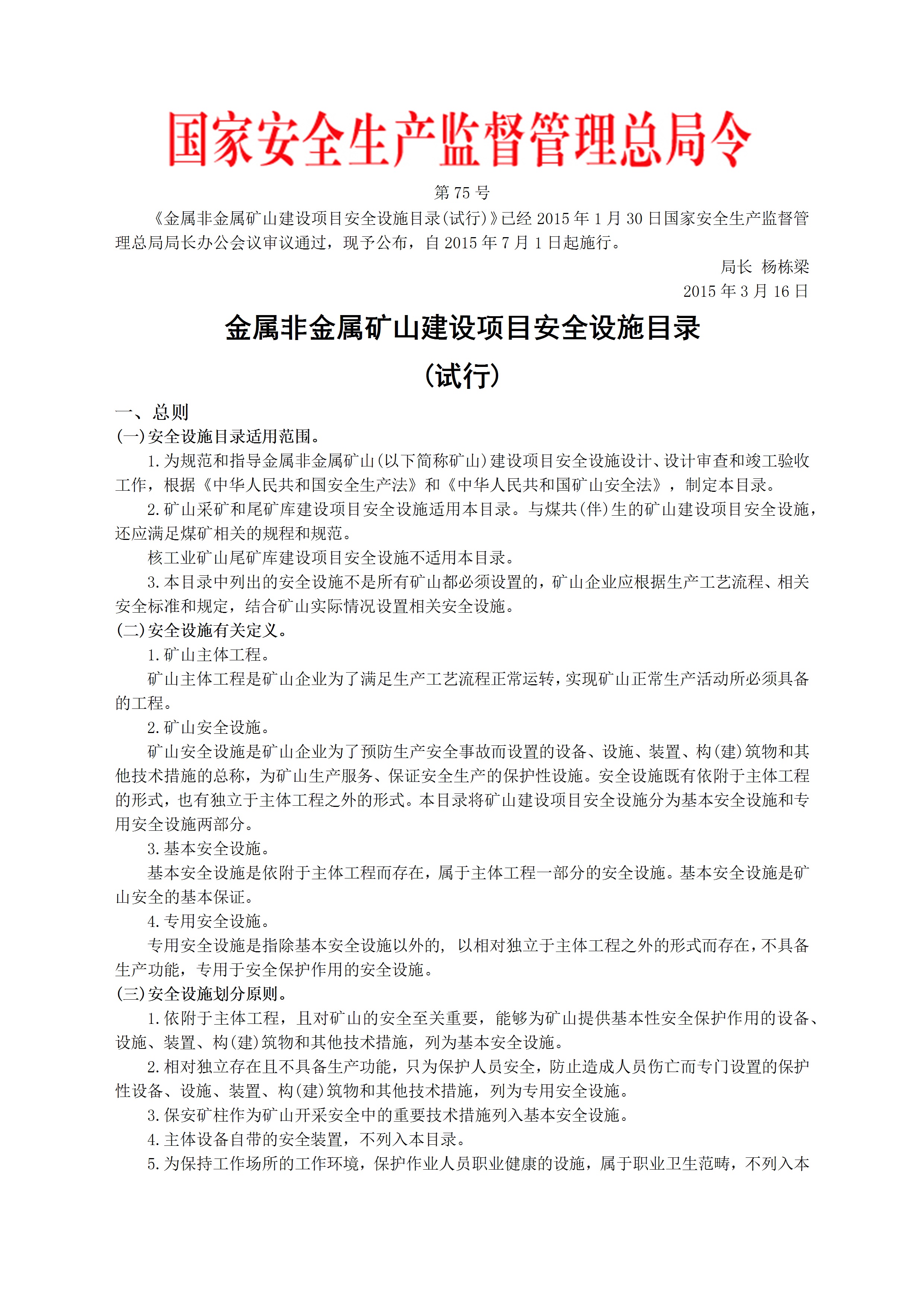 国家安监总局令2015第75号金属非金属矿山建设项目安全设施目录试行[文档]