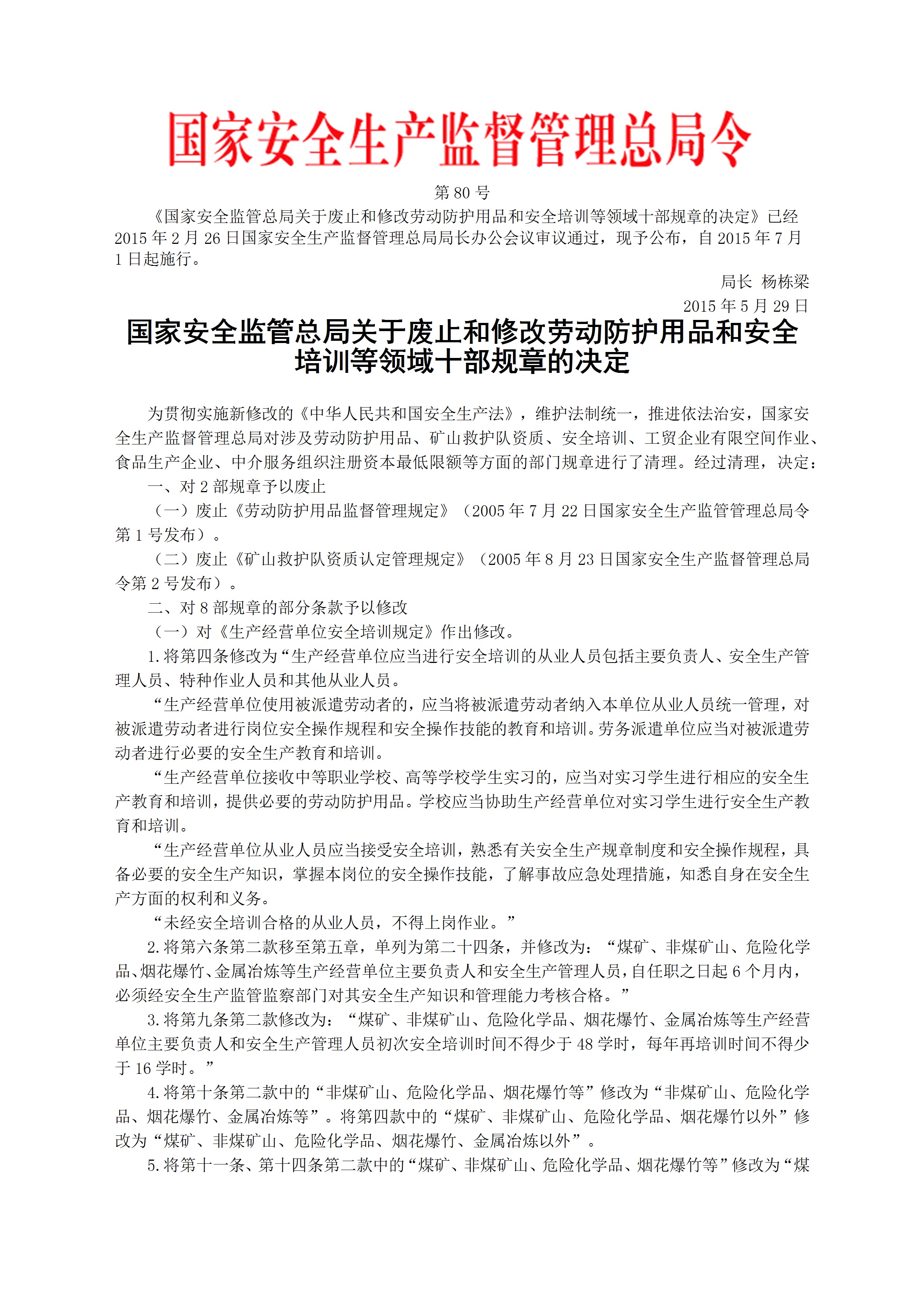 国家安监总局令2015第80号关于废止和修改劳动防护用品和安全培训等领域十部规章的决定[文档]