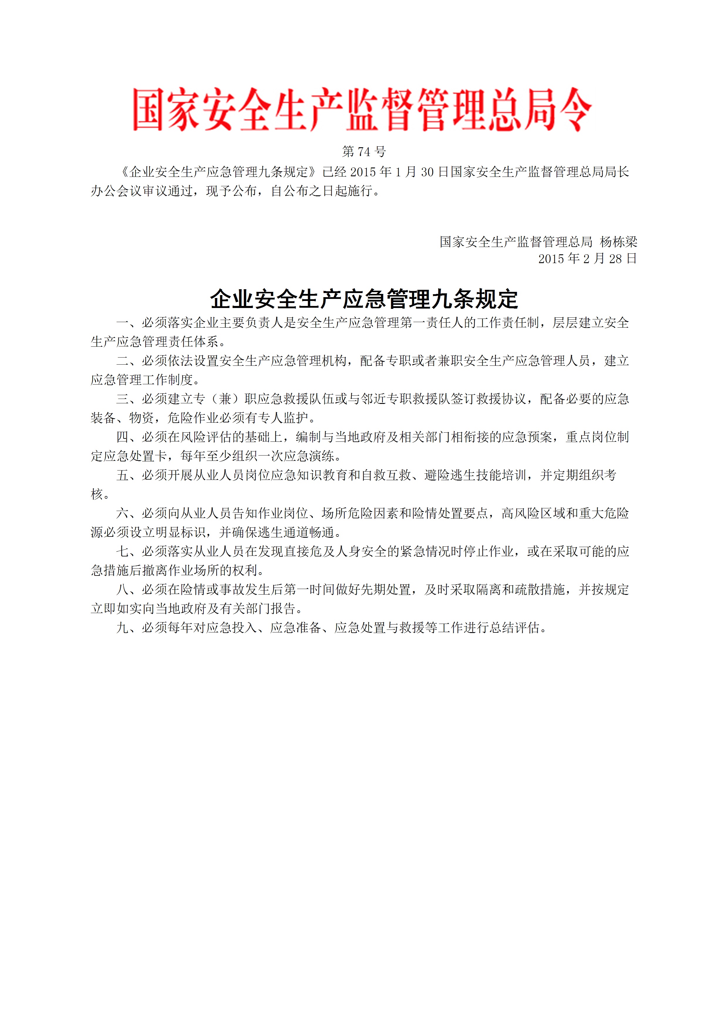 国家安监总局令2015第74号企业安全生产应急管理九条规定国家安监总局令2017第89号废止[文档]