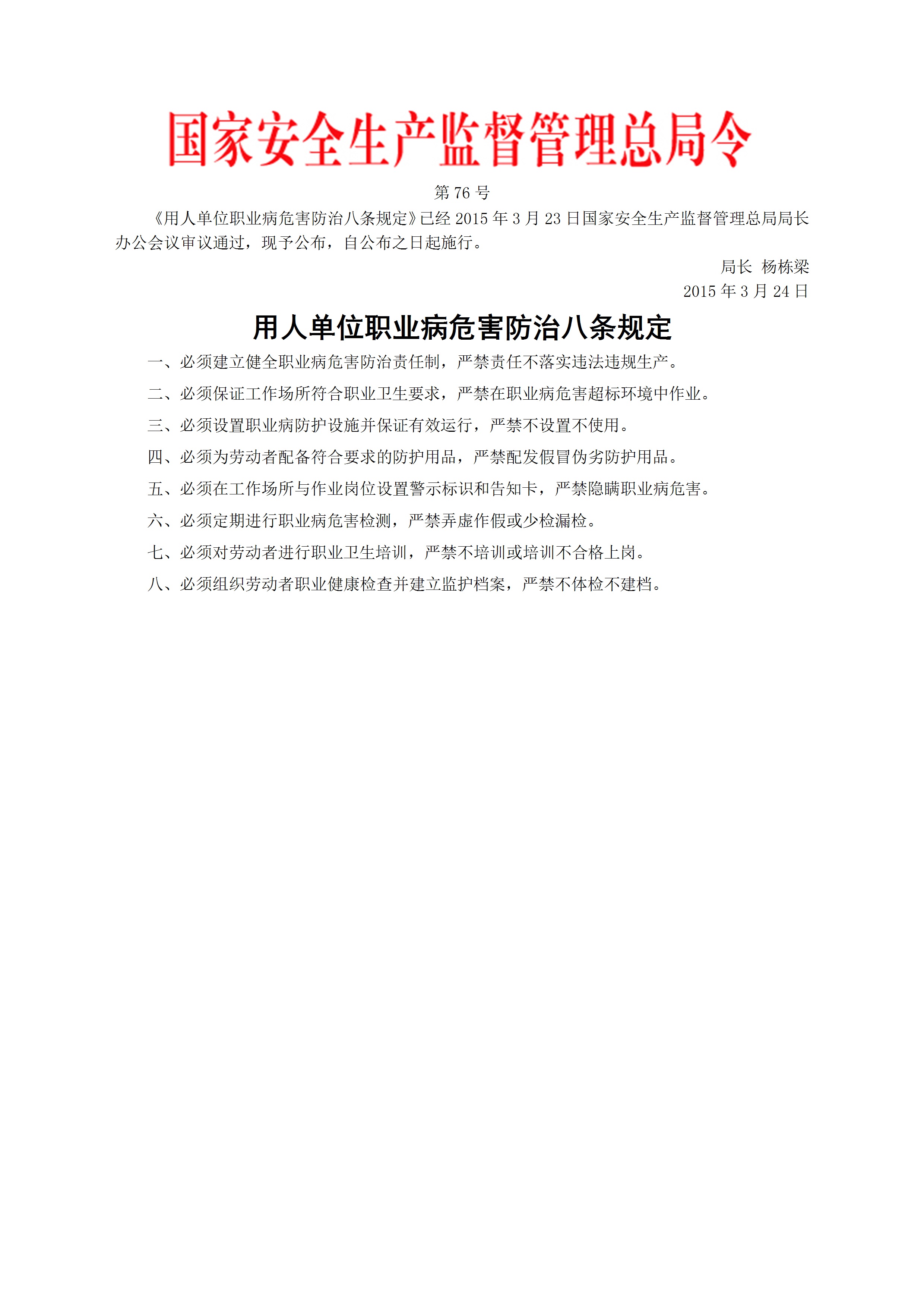 国家安监总局令2015第76号用人单位职业病危害防治八条规定[文档]