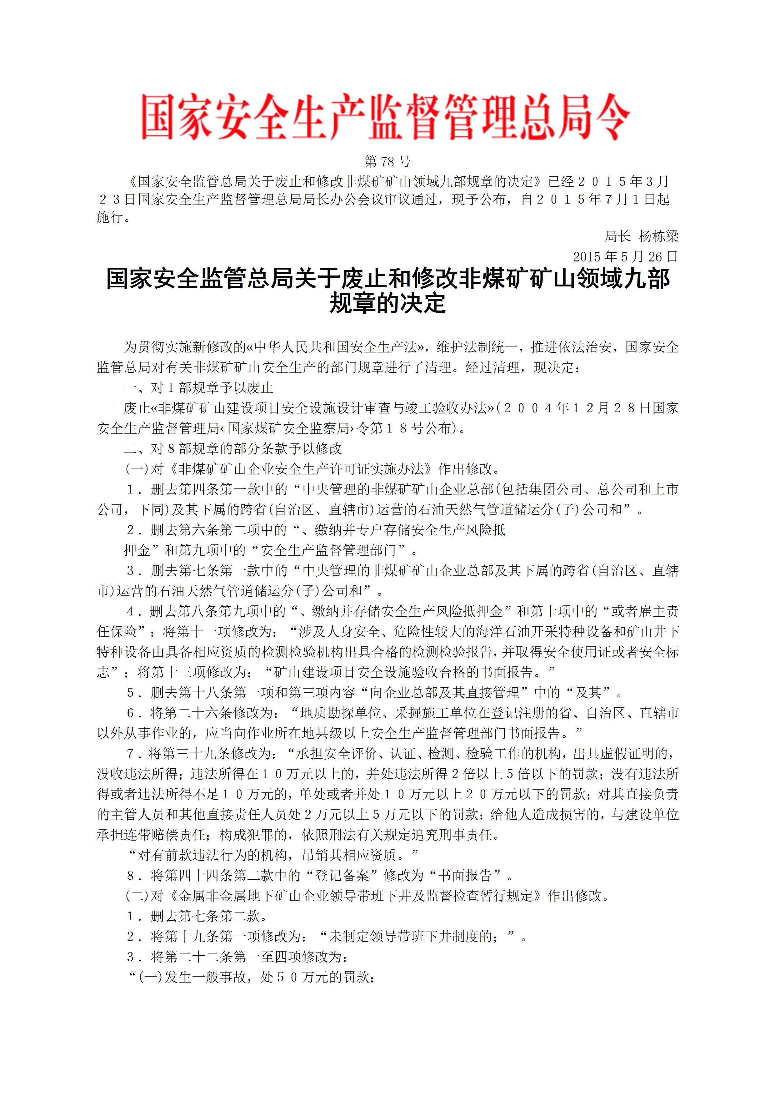 国家安监总局令2015第78号关于废止和修改非煤矿矿山领域九部规章的决定[文档]
