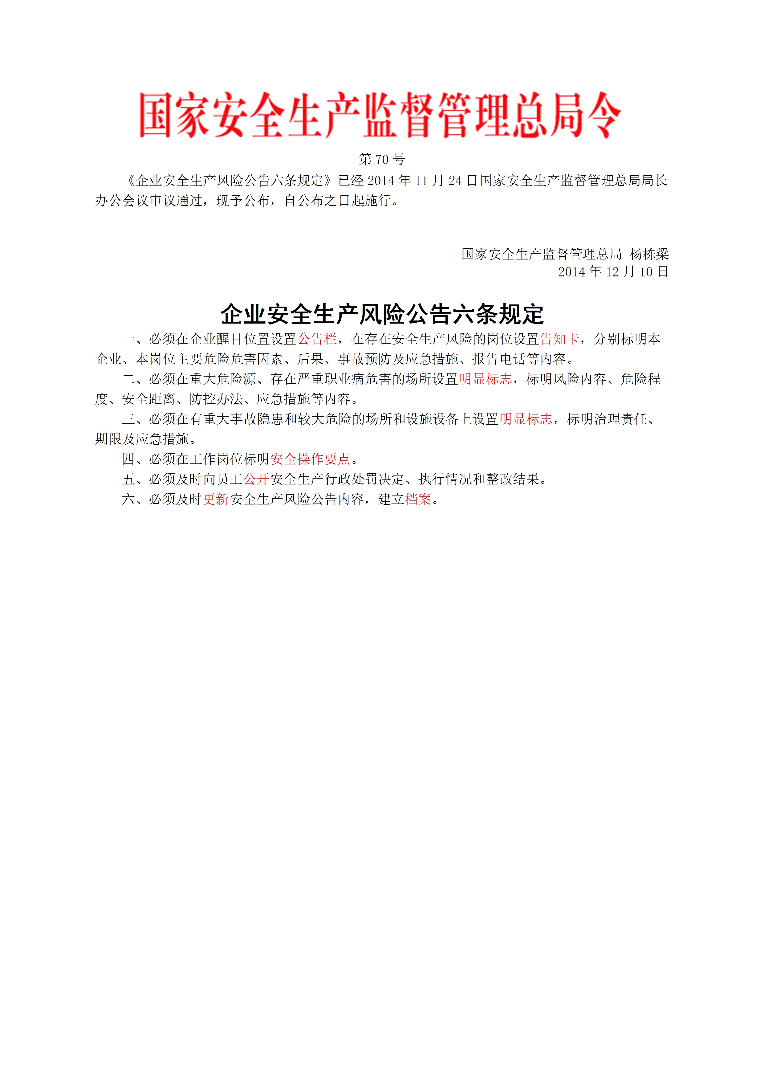 国家安监总局令2014第70号企业安全生产风险公告六条规定国家安监总局令2017第89号废止[文档]