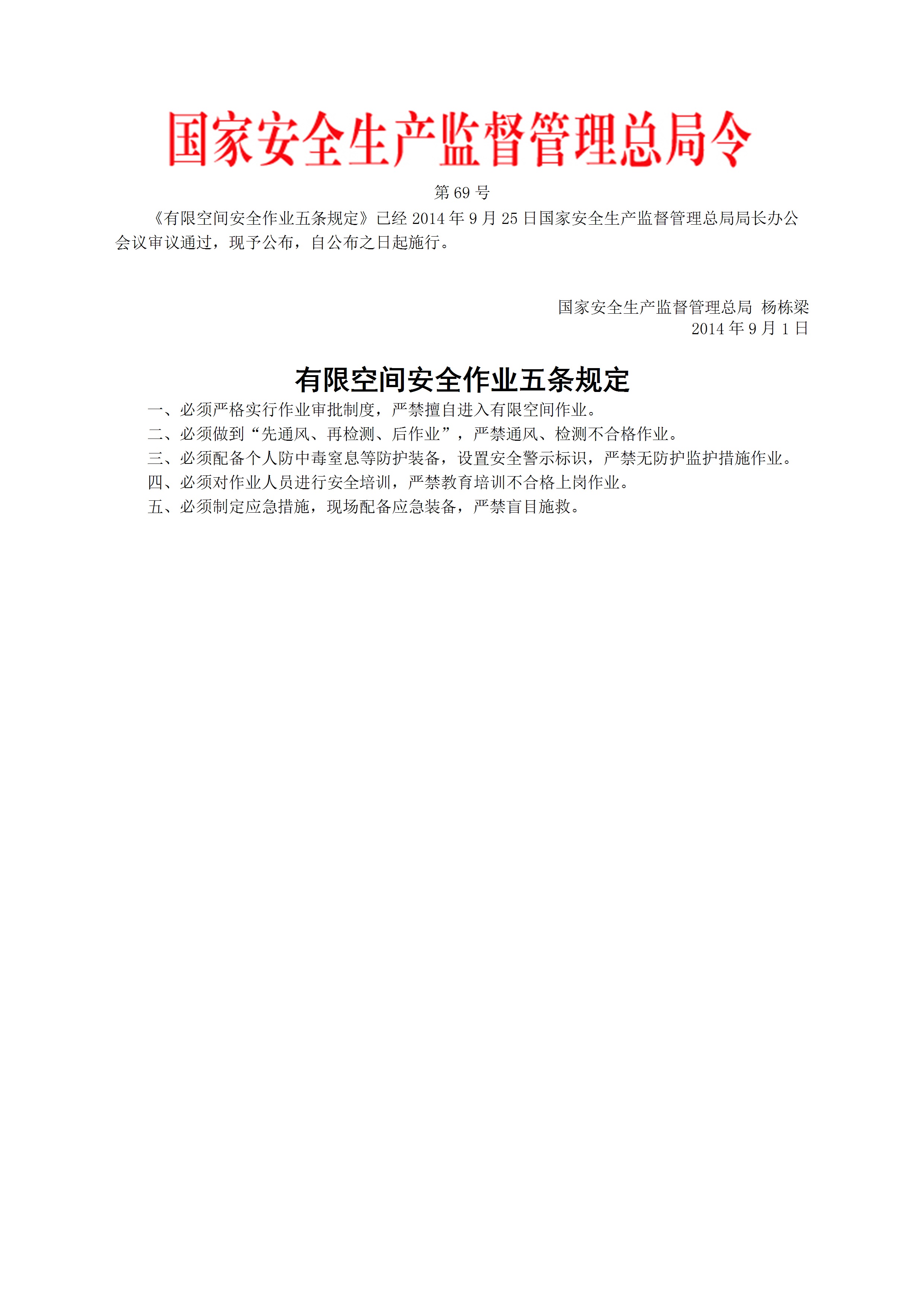 国家安监总局令2014第69号有限空间安全作业五条规定国家安监总局令2017第89号废止[文档]