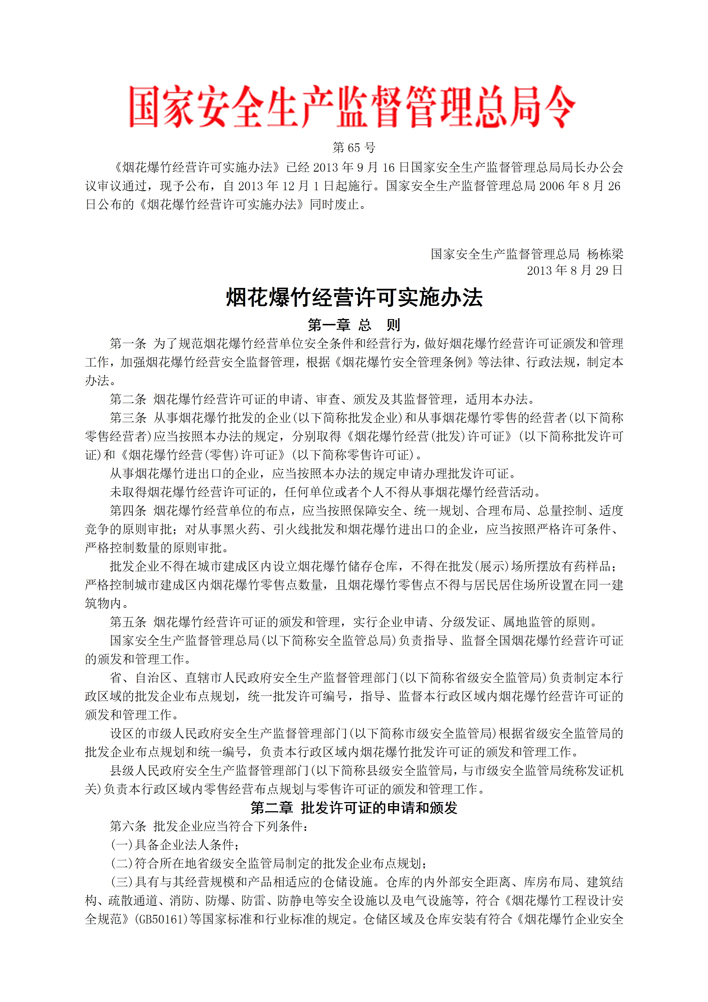 / 国家安监总局令2013第65号烟花爆竹经营许可实施办法[文档]