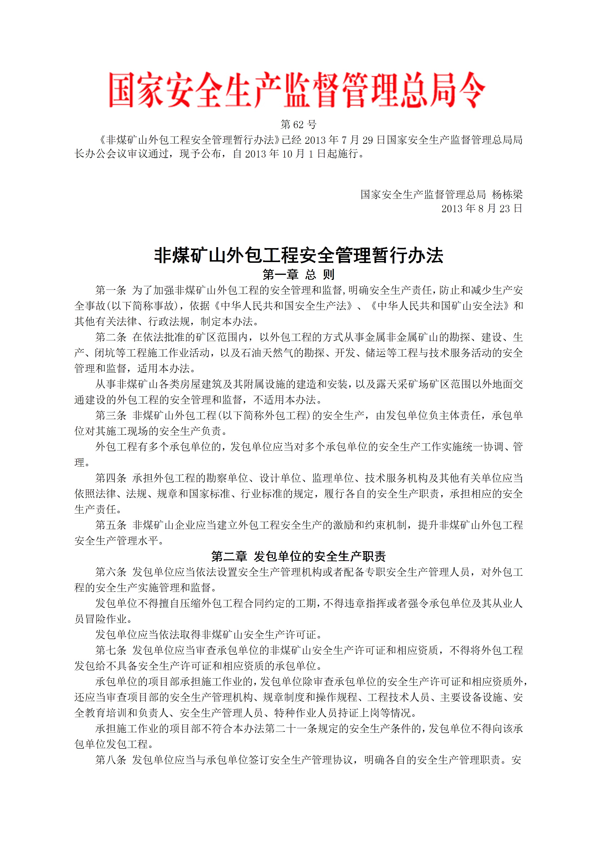 国家安监总局令2013第62号非煤矿山外包工程安全管理暂行办法[文档]