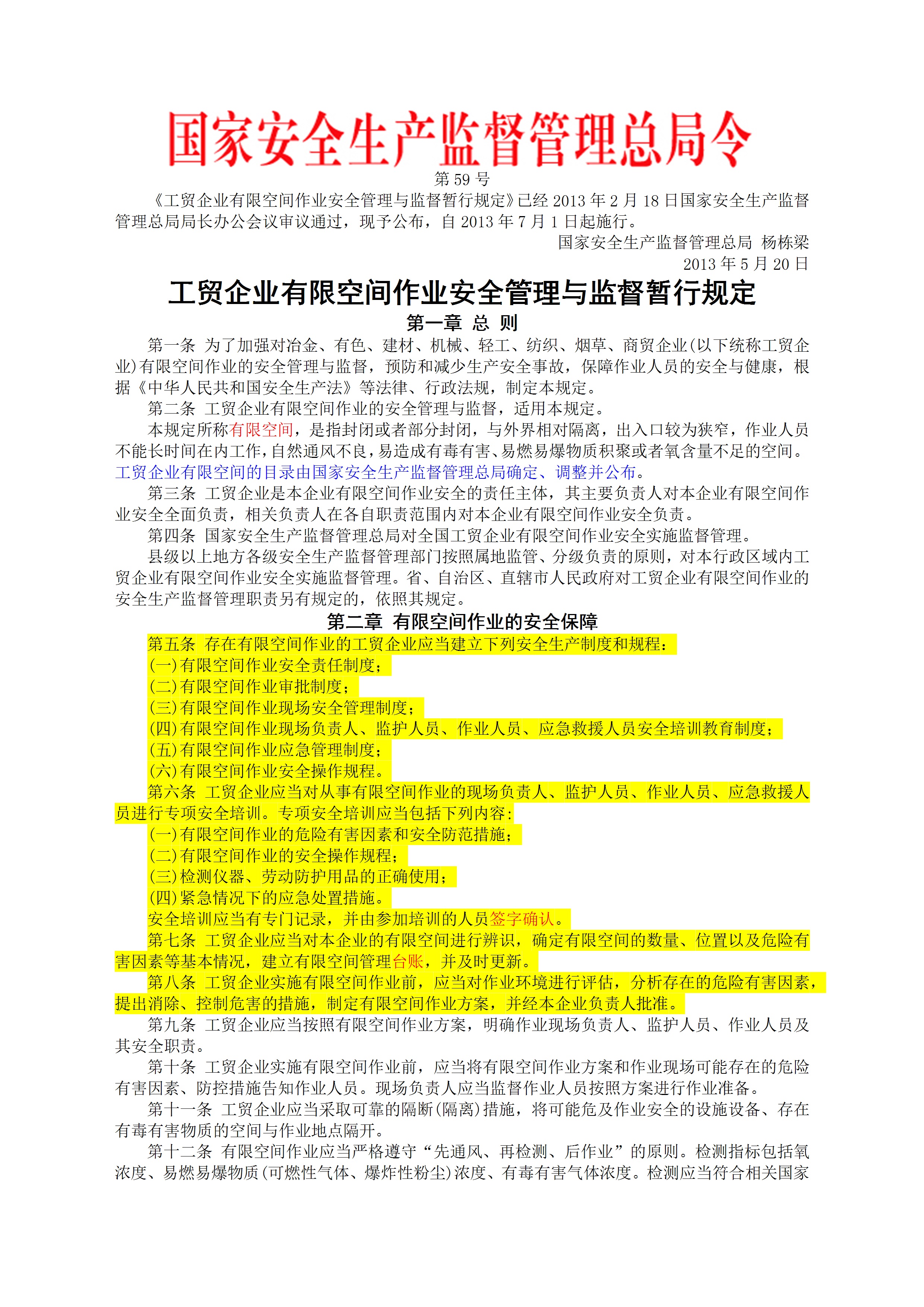 国家安监总局令2013第59号工贸企业有限空间作业安全管理与监督暂行规定[文档]