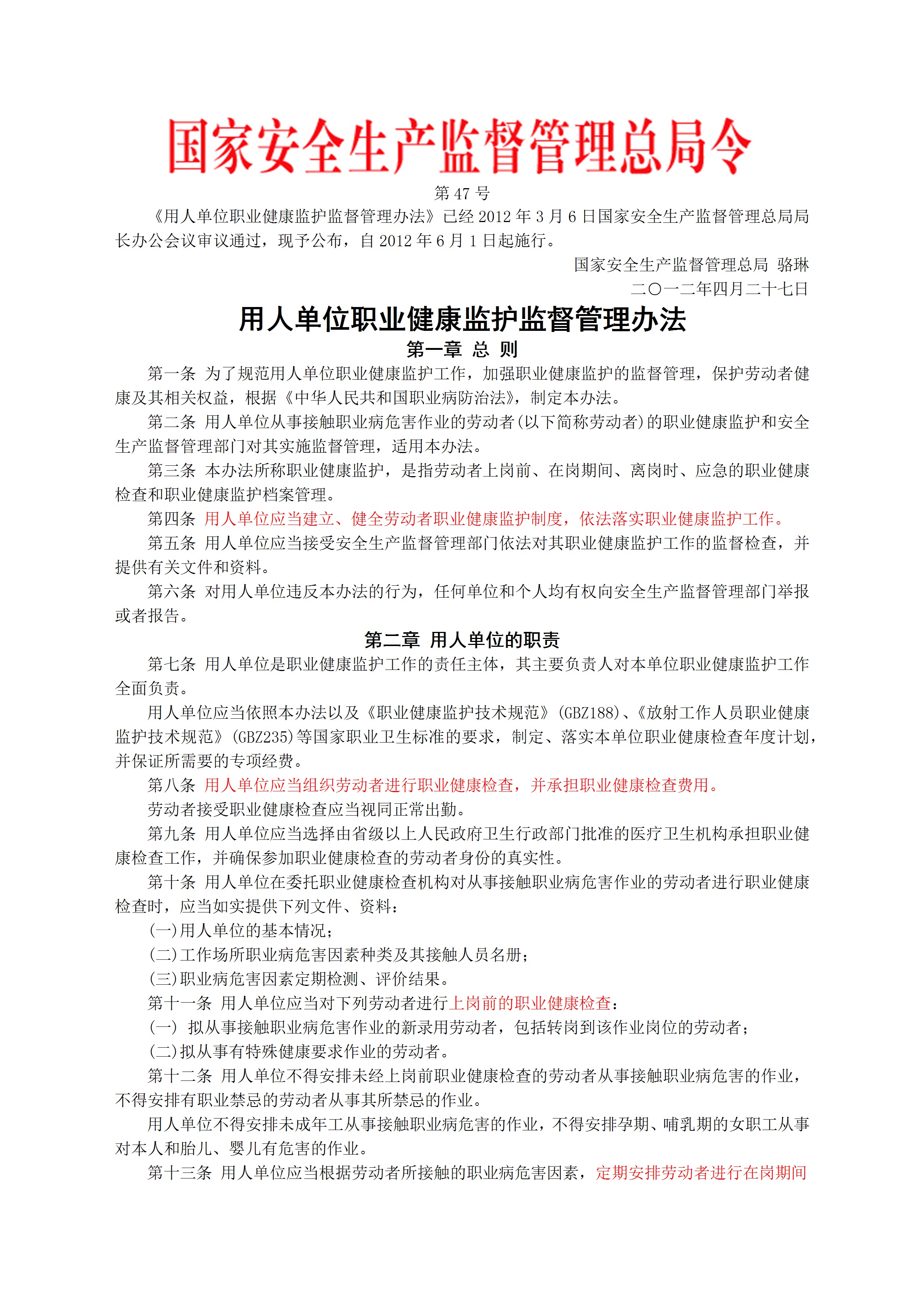 国家安监总局令2012第49号用人单位职业健康监护监督管理办法[文档]