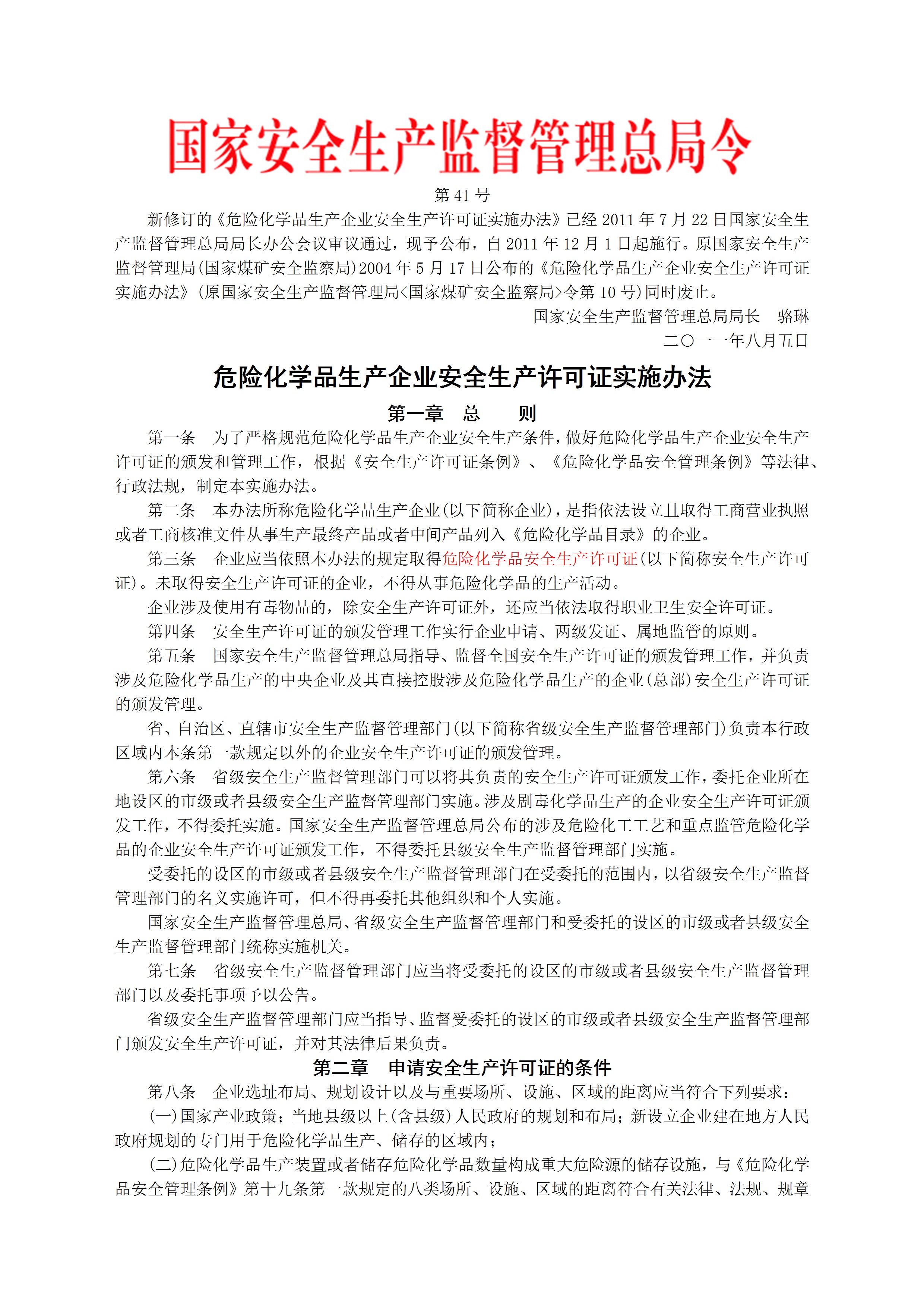 国家安监总局令2011第41号危险化学品生产企业安全生产许可证实施办法[文档]