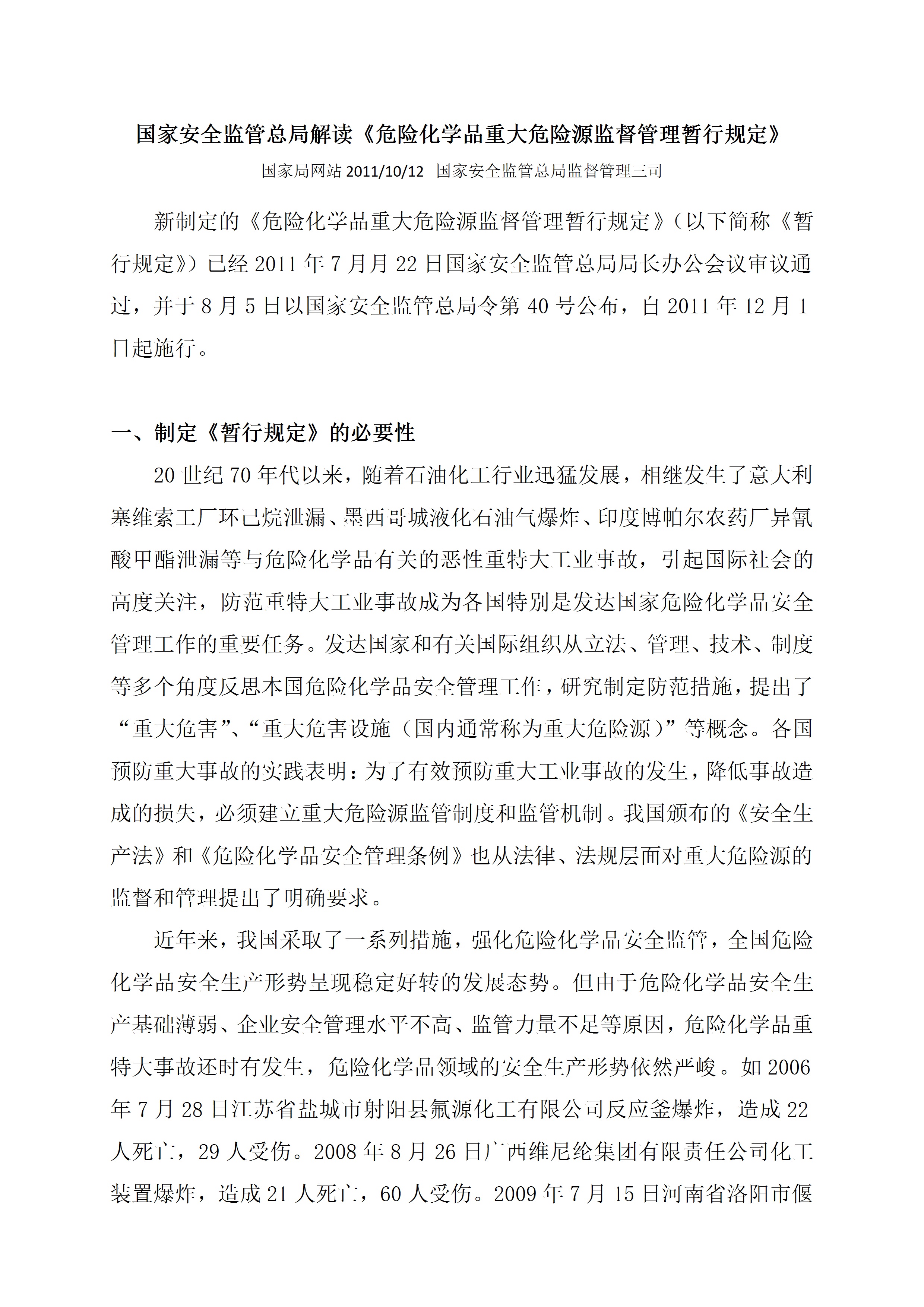 国家安监总局令2011第40号危险化学品重大危险源监督管理暂行规定-国家安全监管总局解读[文档]