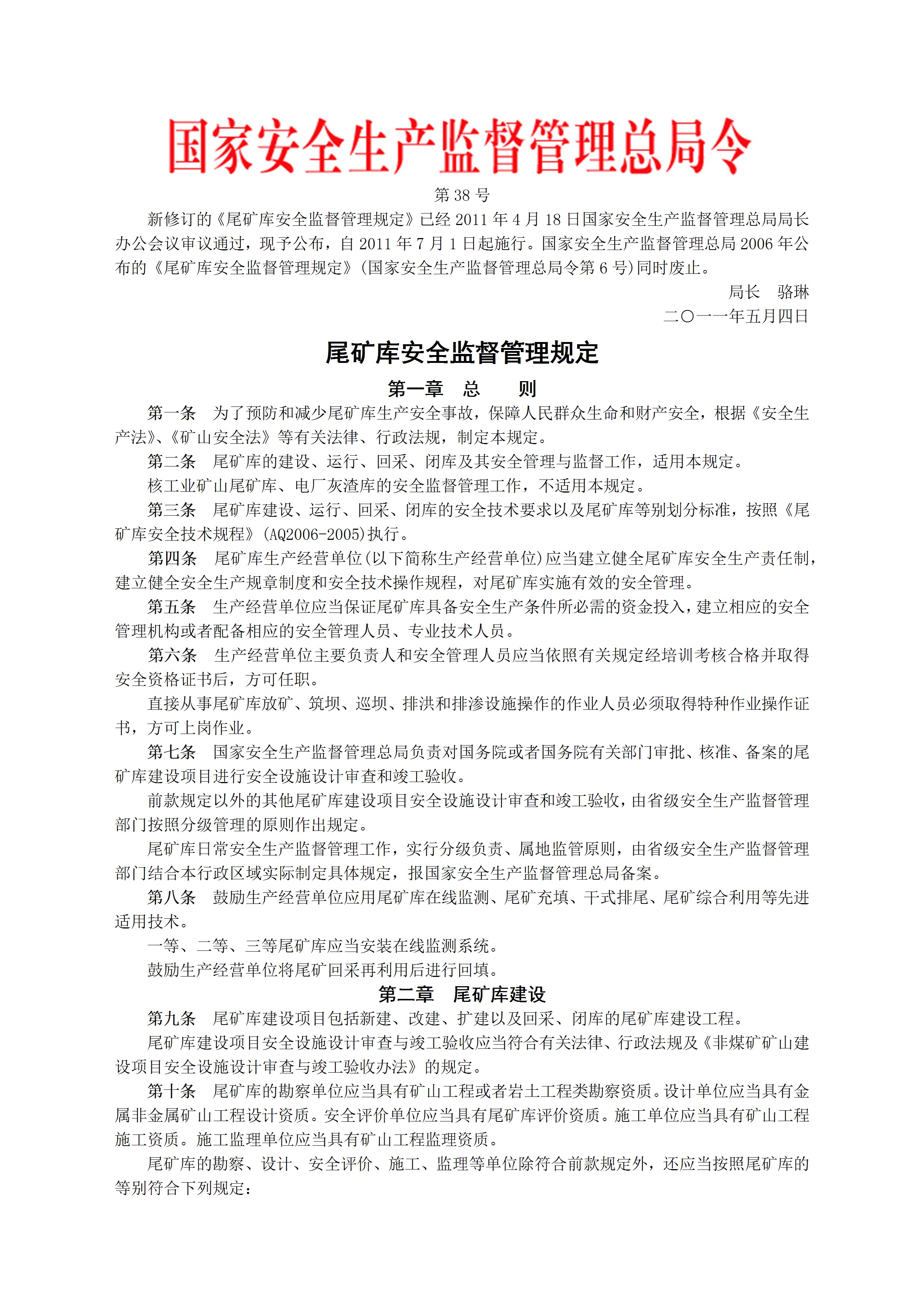 / 国家安监总局令2011第38号尾矿库安全监督管理规定[文档]