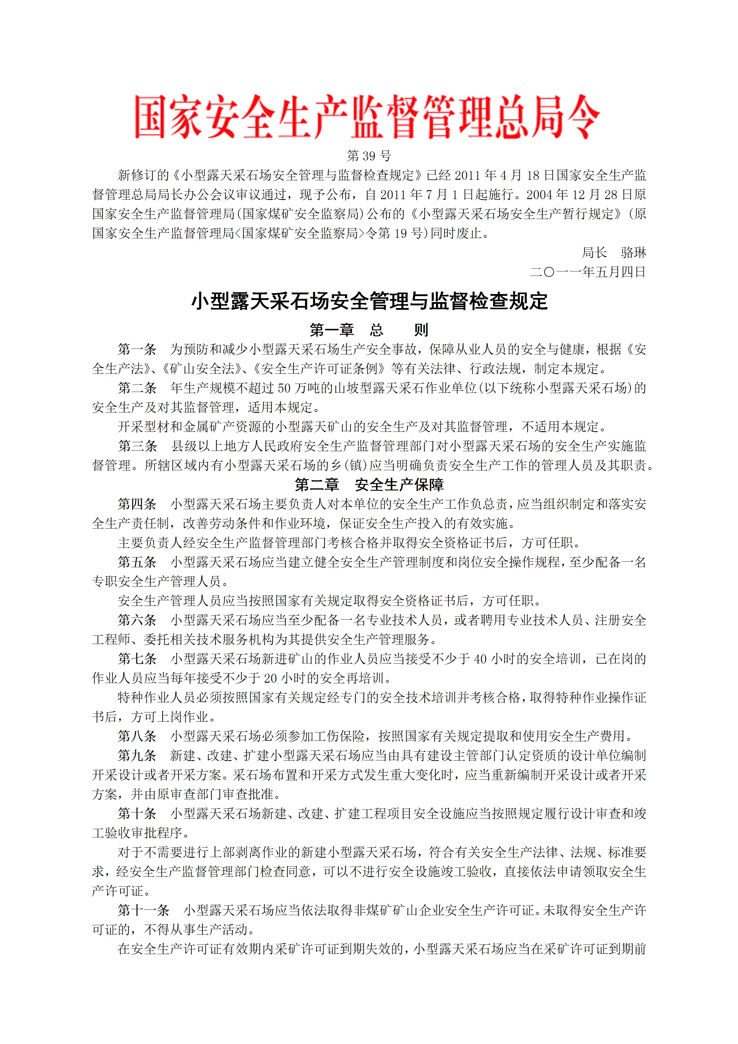 国家安监总局令2011第39号小型露天采石场安全管理与监督检查规定[文档]