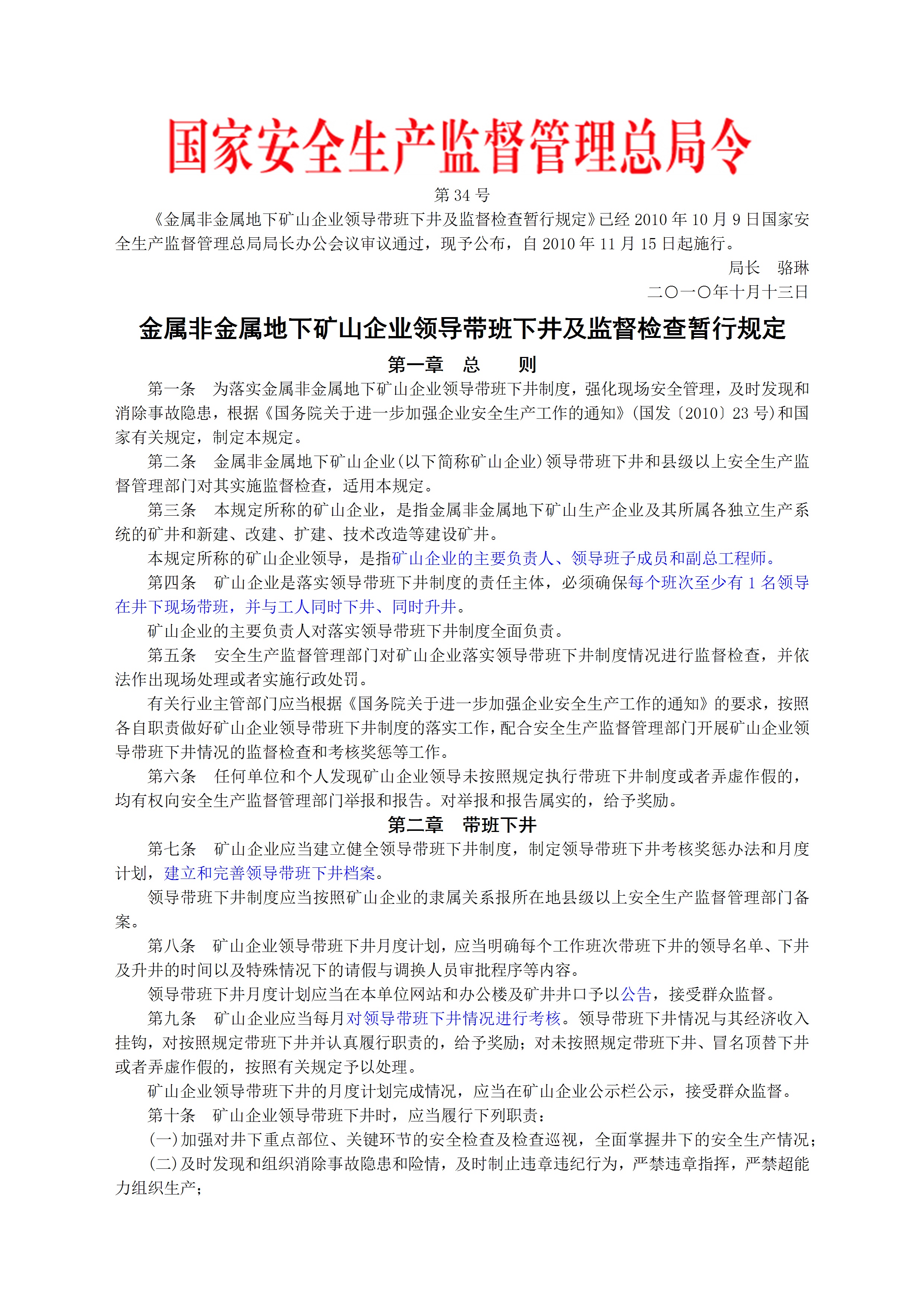 国家安监总局令2010第34号金属非金属地下矿山企业领导带班下井及监督检查暂行规定[文档]