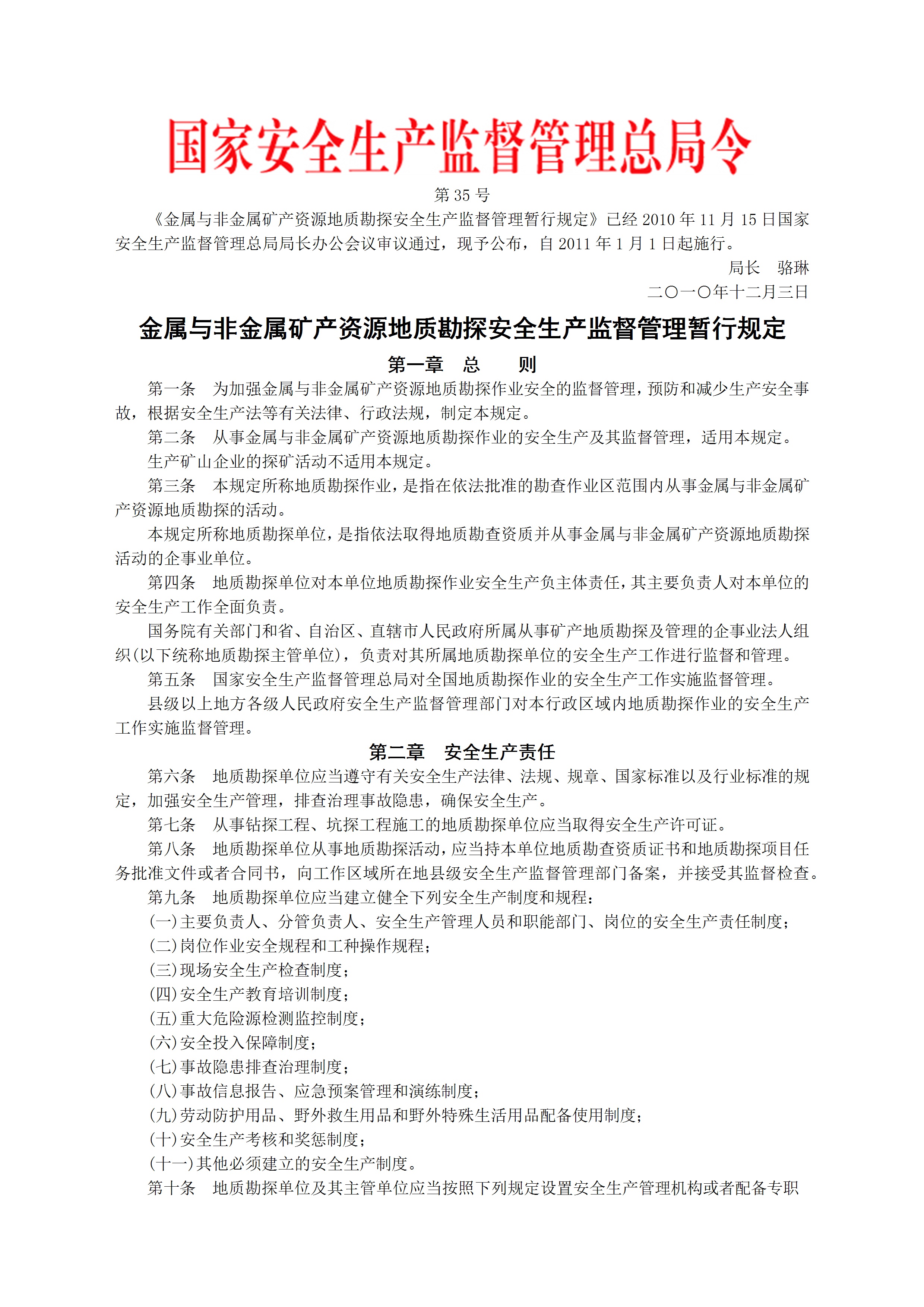 国家安监总局令2010第35号金属与非金属矿产资源地质勘探安全生产监督管理暂行规定[文档]
