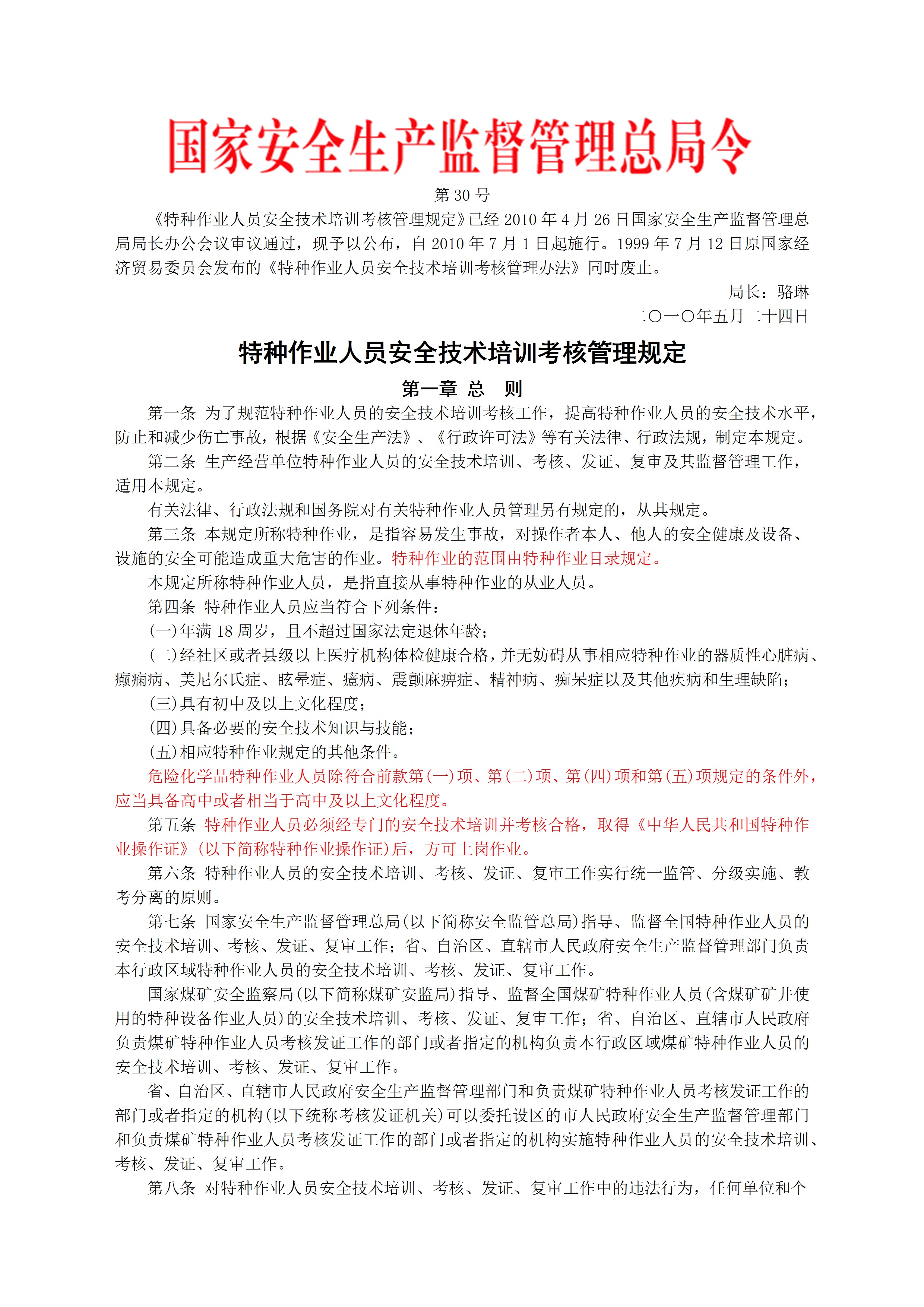 国家安监总局令2010第30号特种作业人员安全技术培训考核管理规定安监总局[文档]