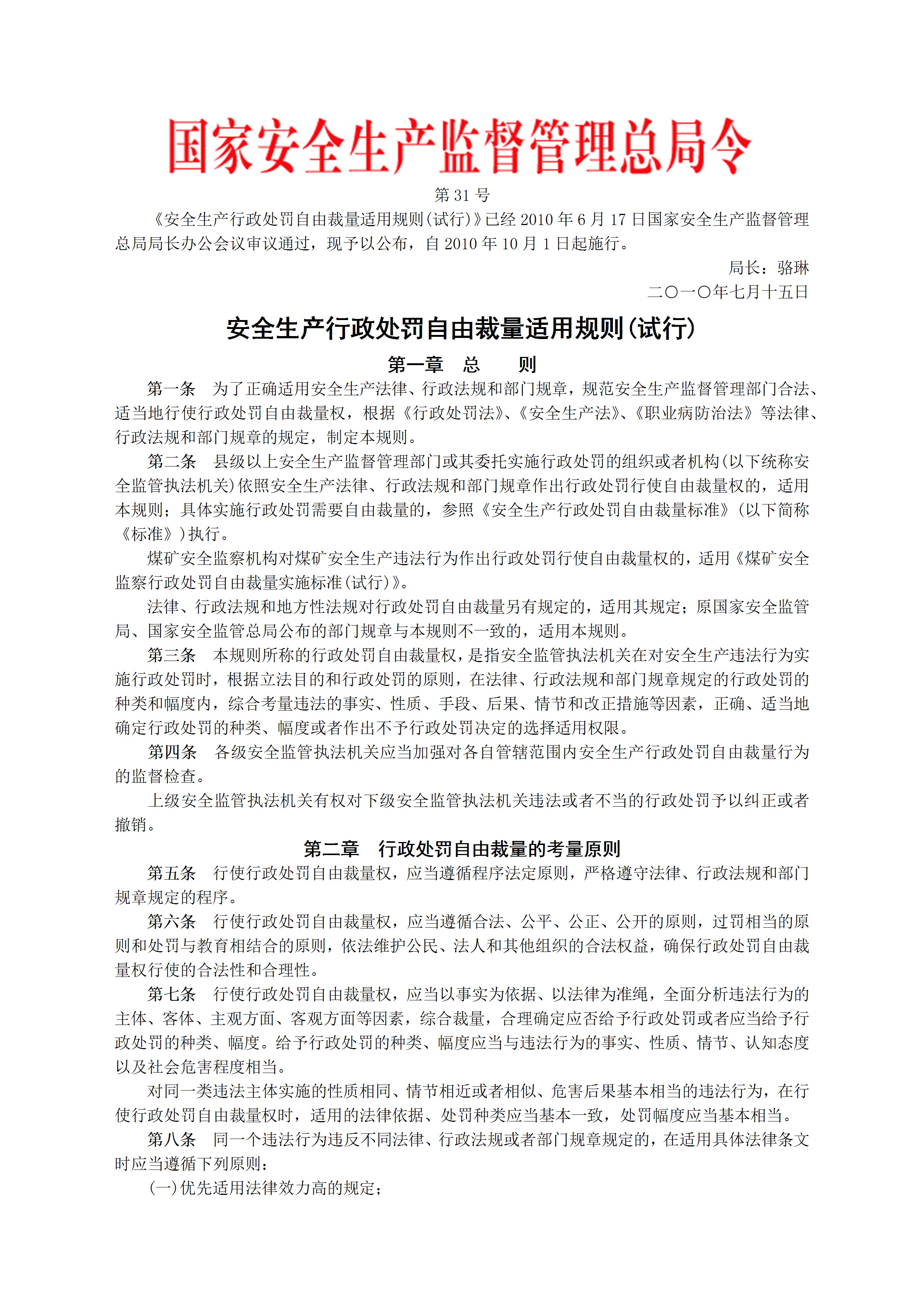 国家安监总局令2010第31号安全生产行政处罚自由裁量适用规则试行[文档]