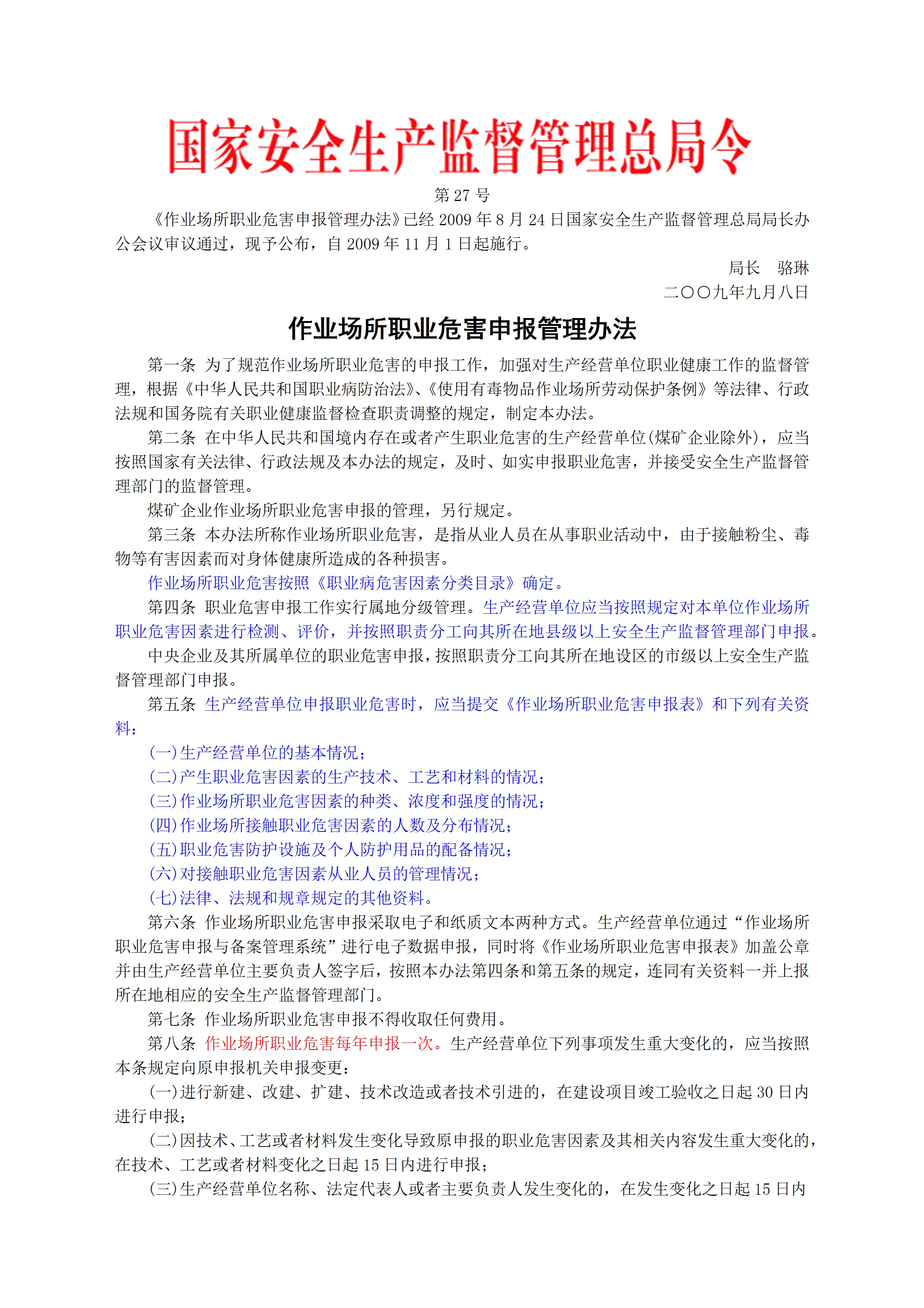 国家安监总局令2009第27号作业场所职业危害申报管理办法安监总局令2012第48号废止[文档]