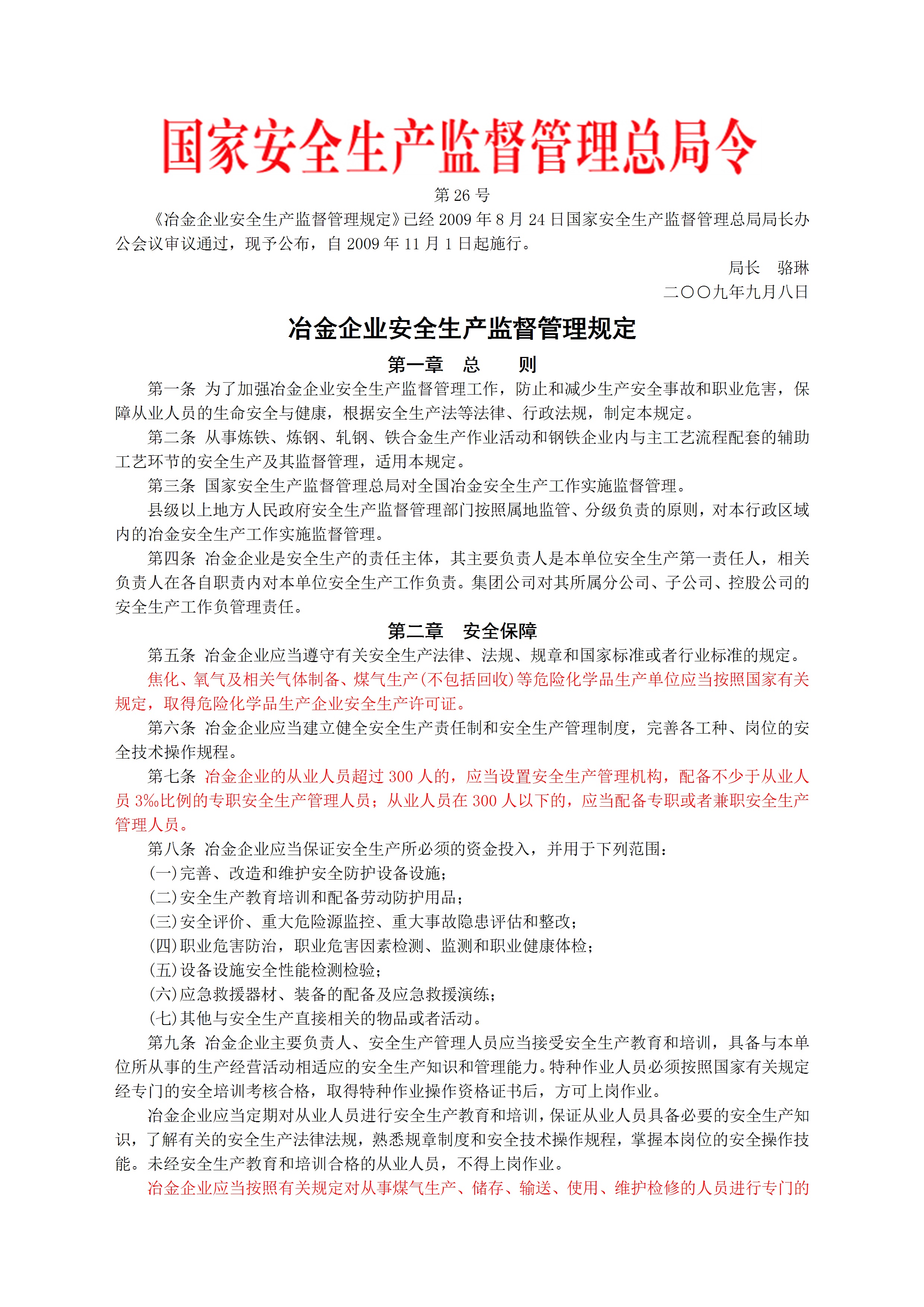 / 国家安监总局令2009第26号冶金企业安全生产监督管理规定[文档]