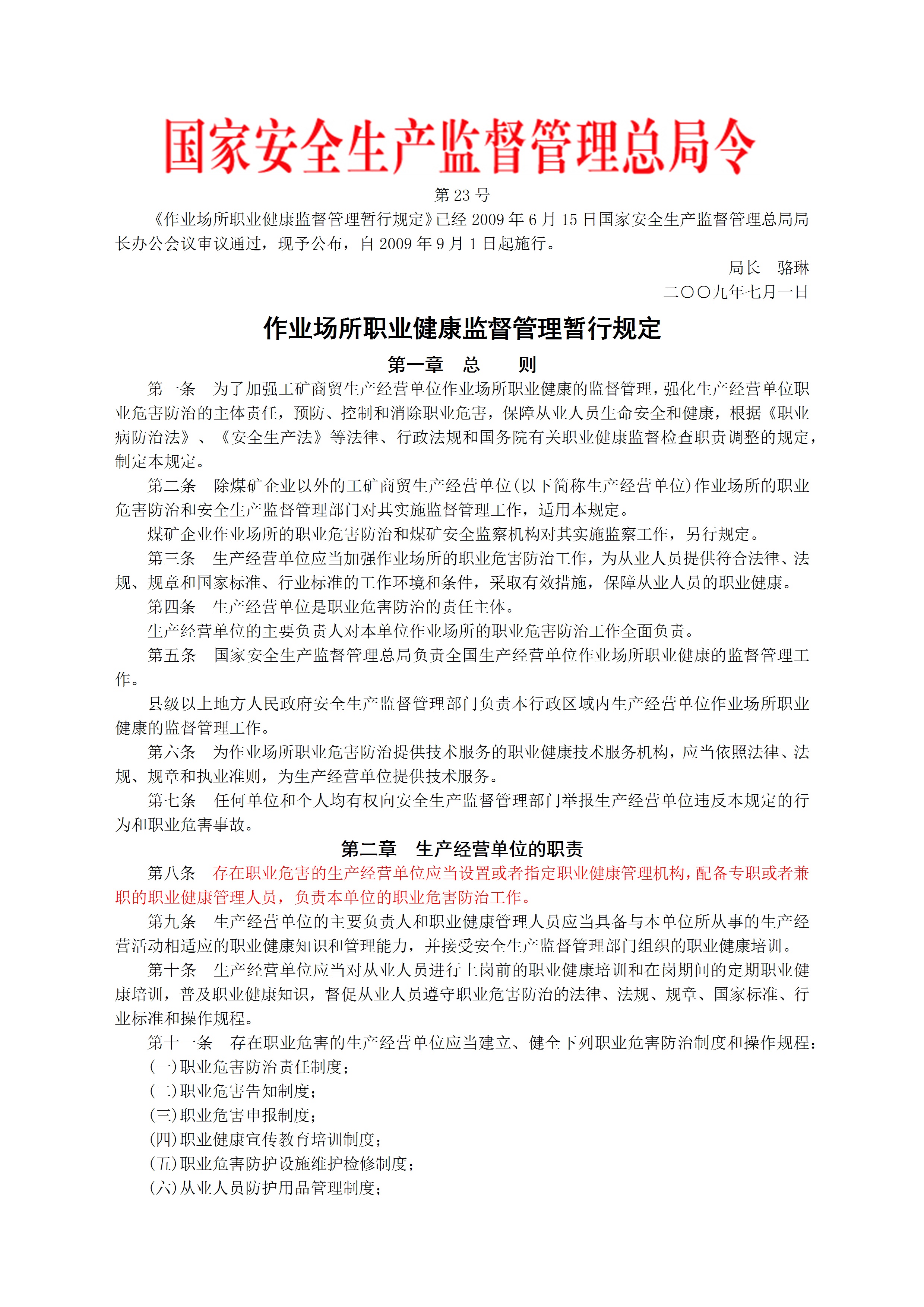 国家安监总局令2009第23号作业场所职业健康监督管理暂行规定安监总局令2012第47号废止[文档]