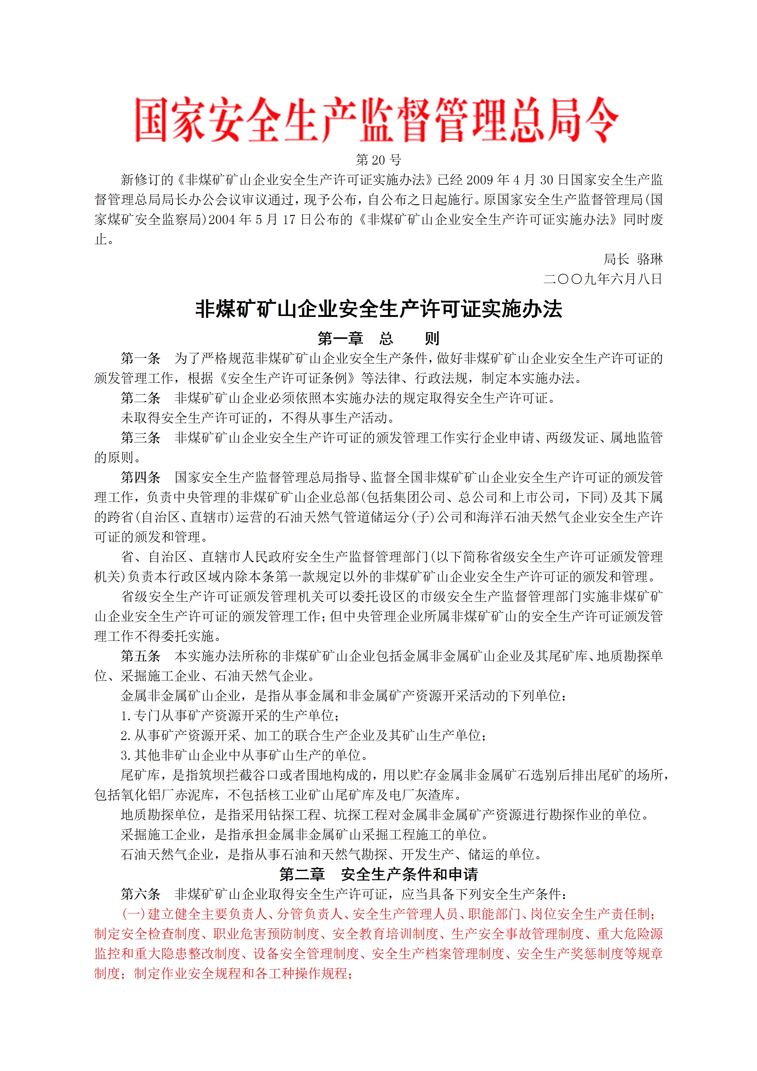 国家安监总局令2009第20号非煤矿矿山企业安全生产许可证实施办法[文档]
