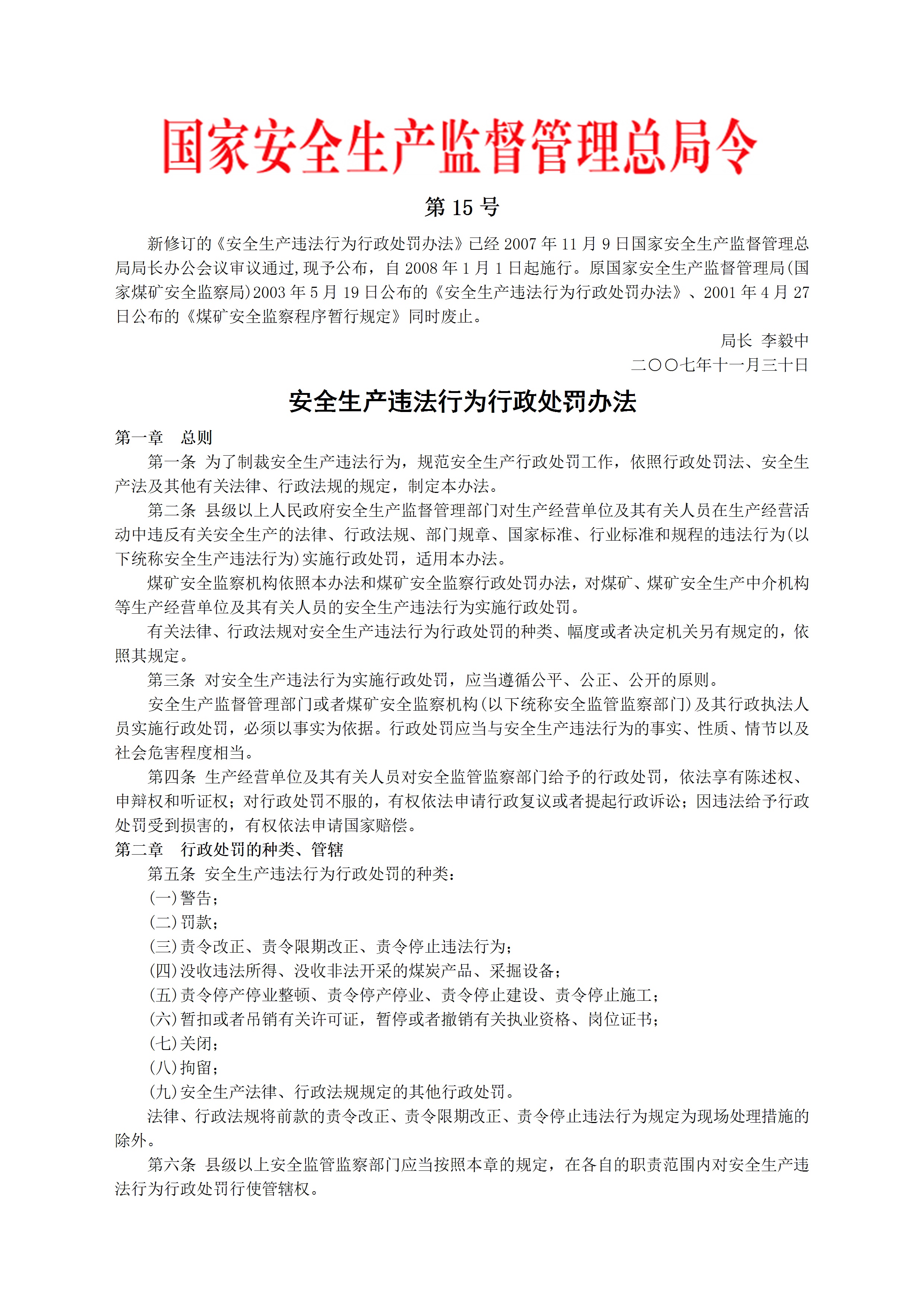 国家安监总局令2007第15号安全生产违法行为行政处罚办法安监总局令2015第77号修改[文档]