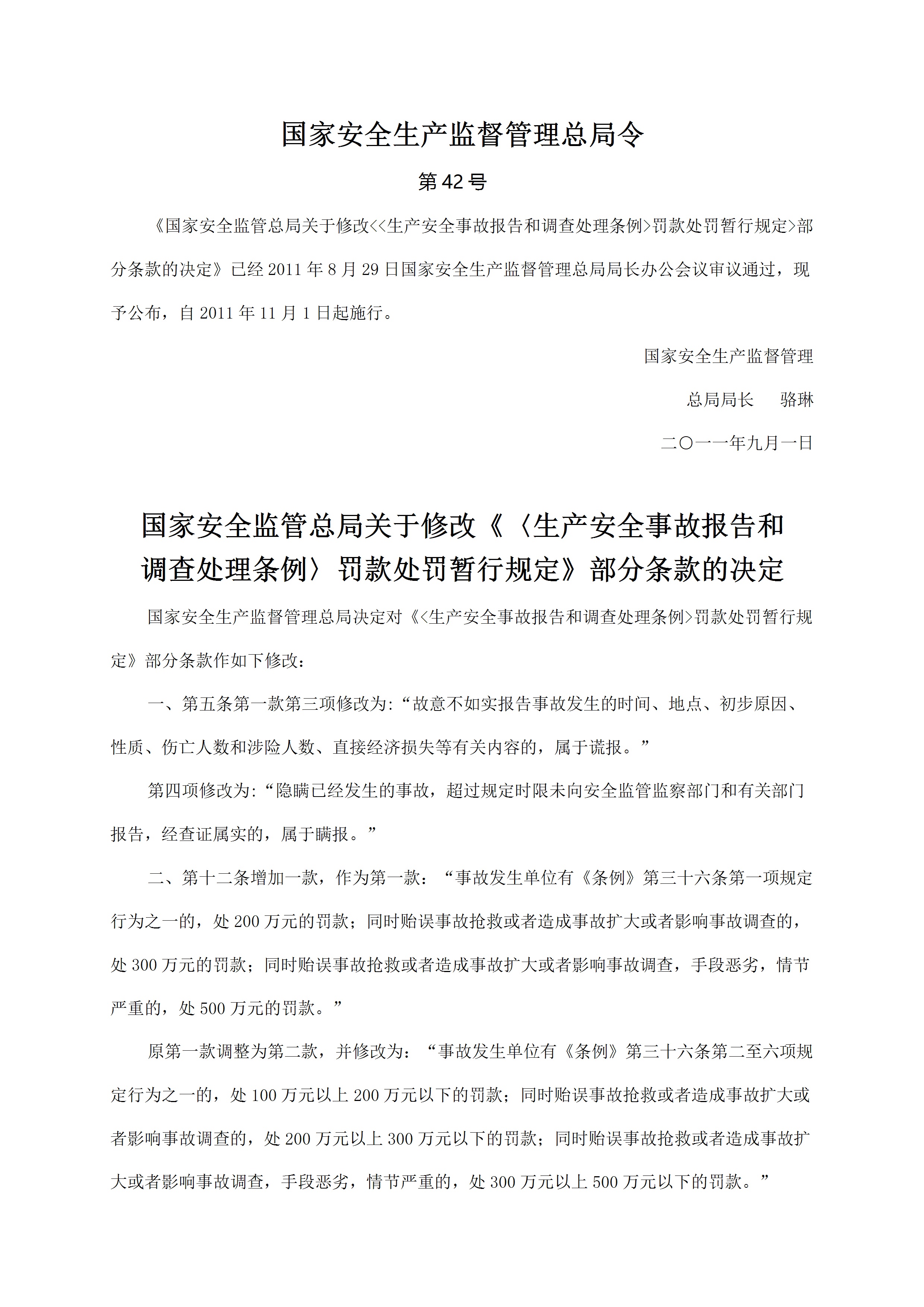 国家安全监管总局关于修改生产安全事故报告和调查处理条例罚款处罚暂行规定部分条款的决定[文档]