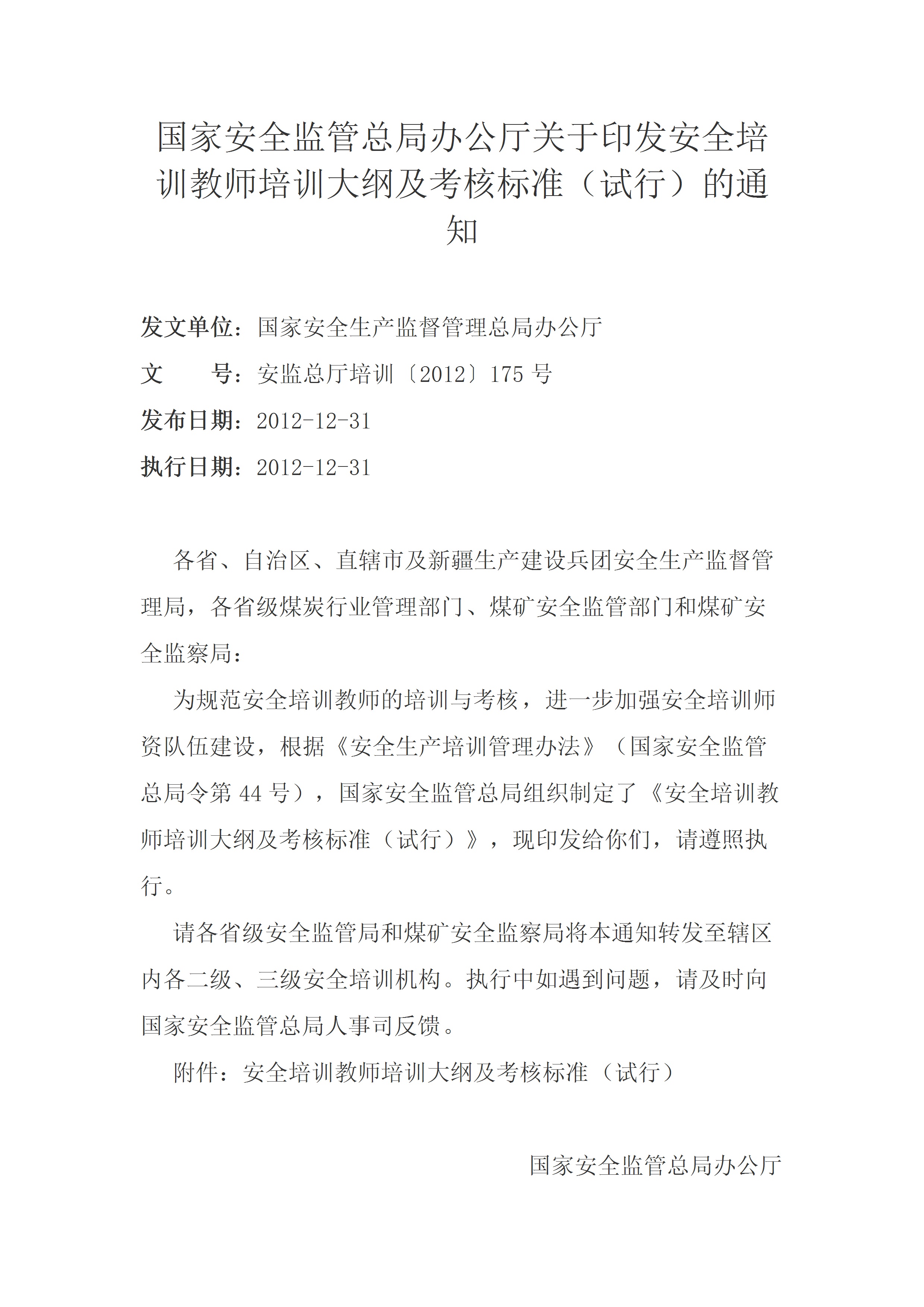 国家安全监管总局办公厅关于印发安全培训教师培训大纲及考核标准试行的通知[文档]