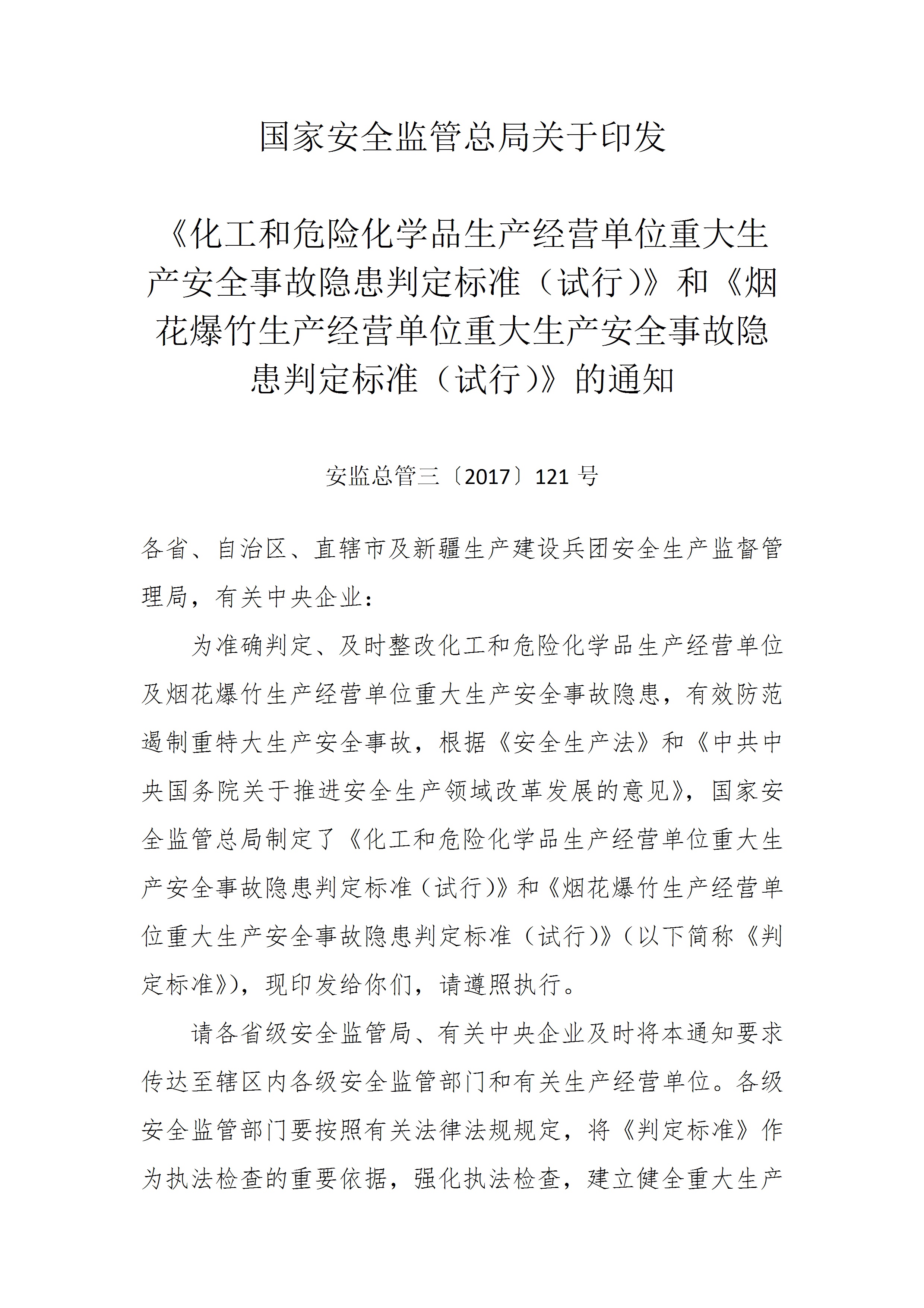 国家安全监管总局关于印发化工和危险化学品生产经营单位重大生产安全事故隐患判定标准试[文档]