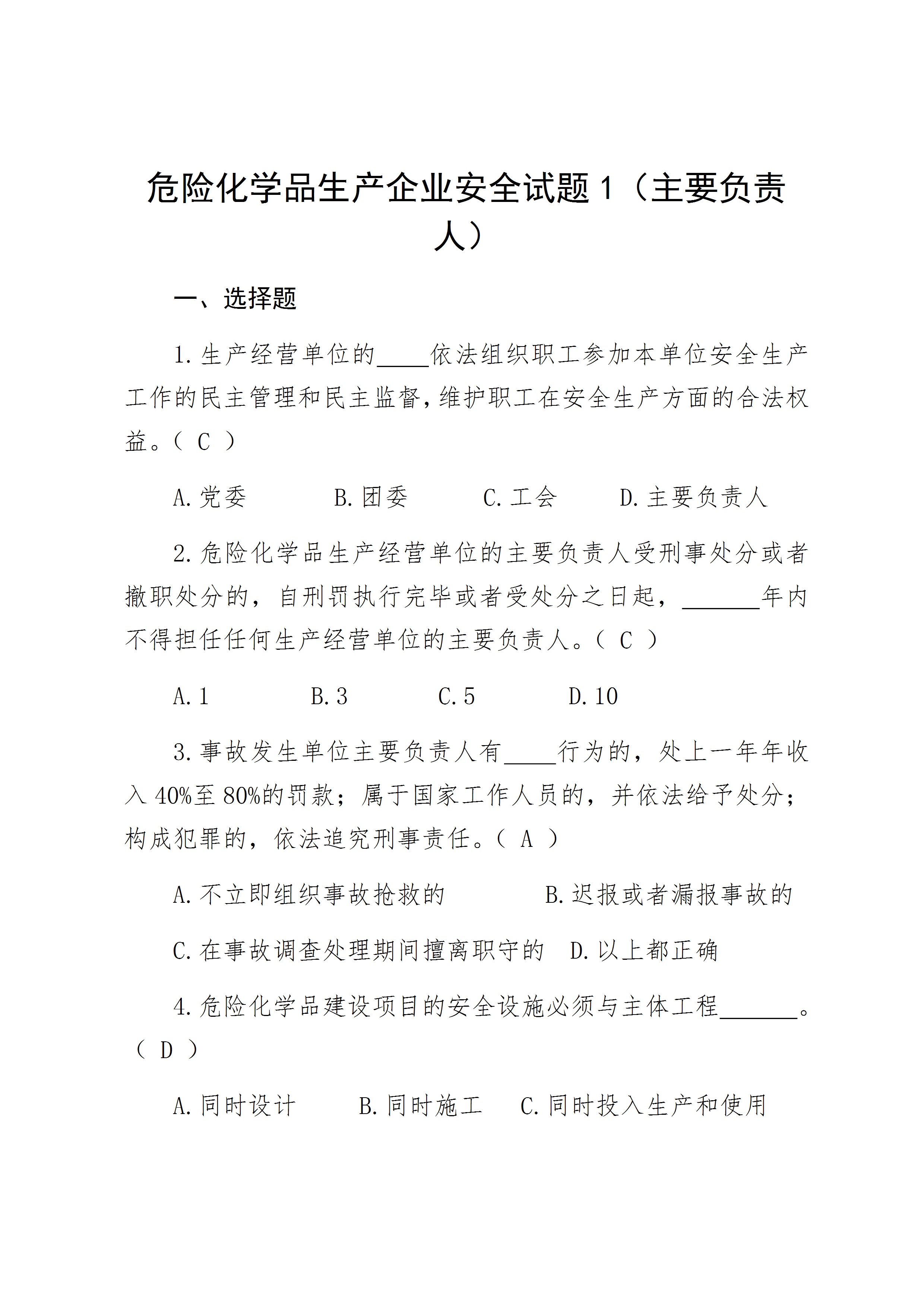 / 危险化学品生产企业安全试题-主要负责人[文档]