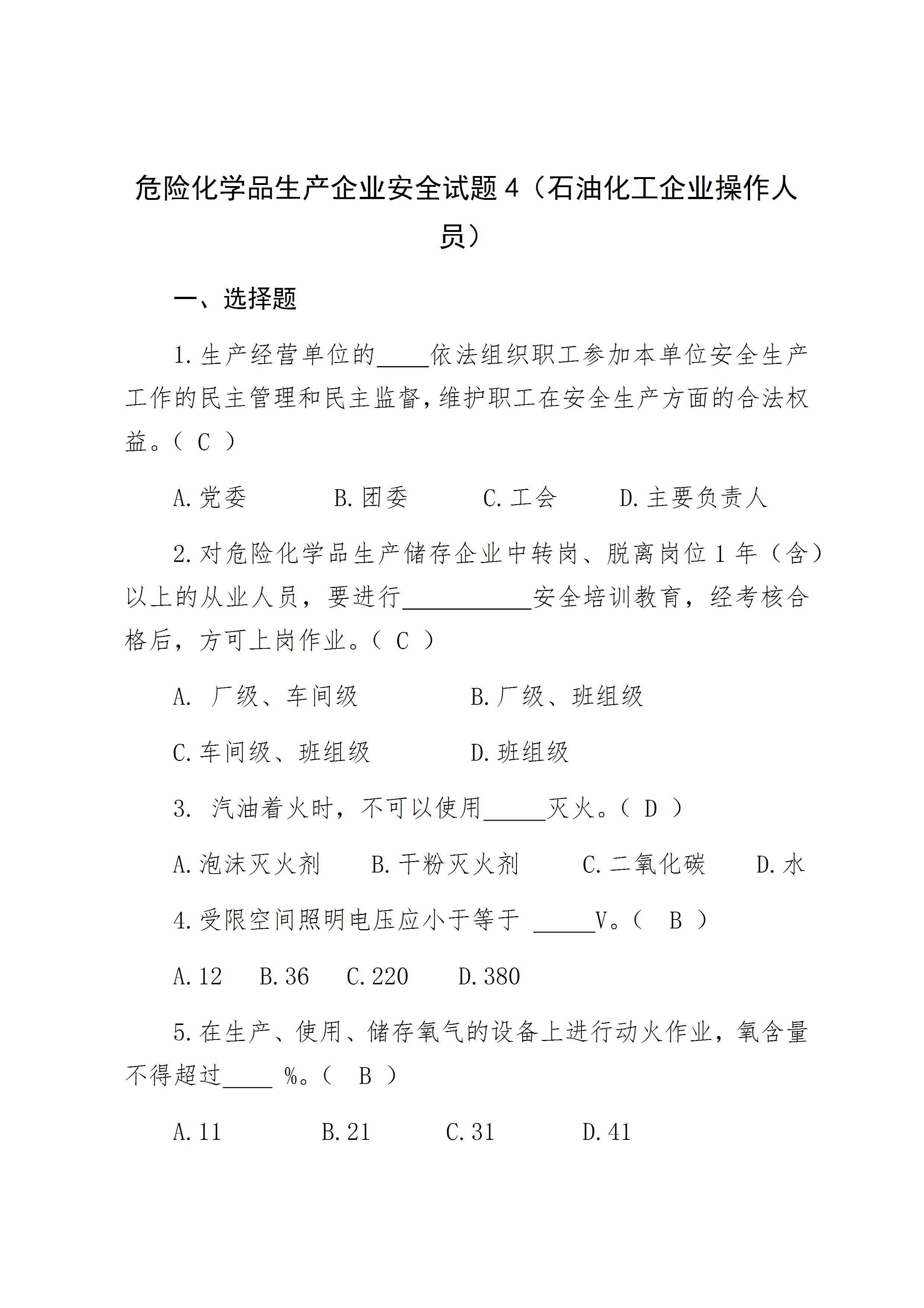 / 危险化学品生产企业安全试题-石油化工从业人员[文档]