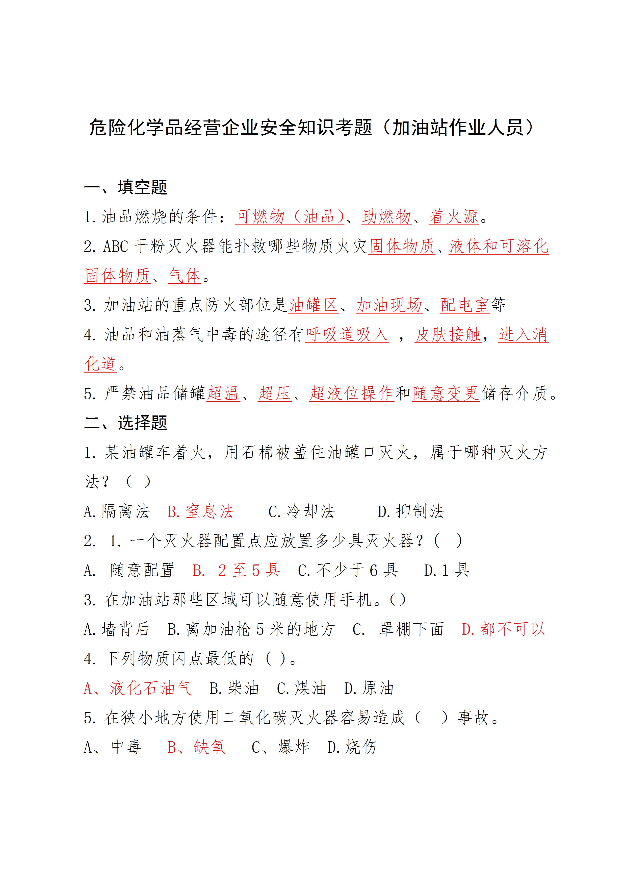 危险化学品经营企业安全知识考题加油站作业人员[文档]