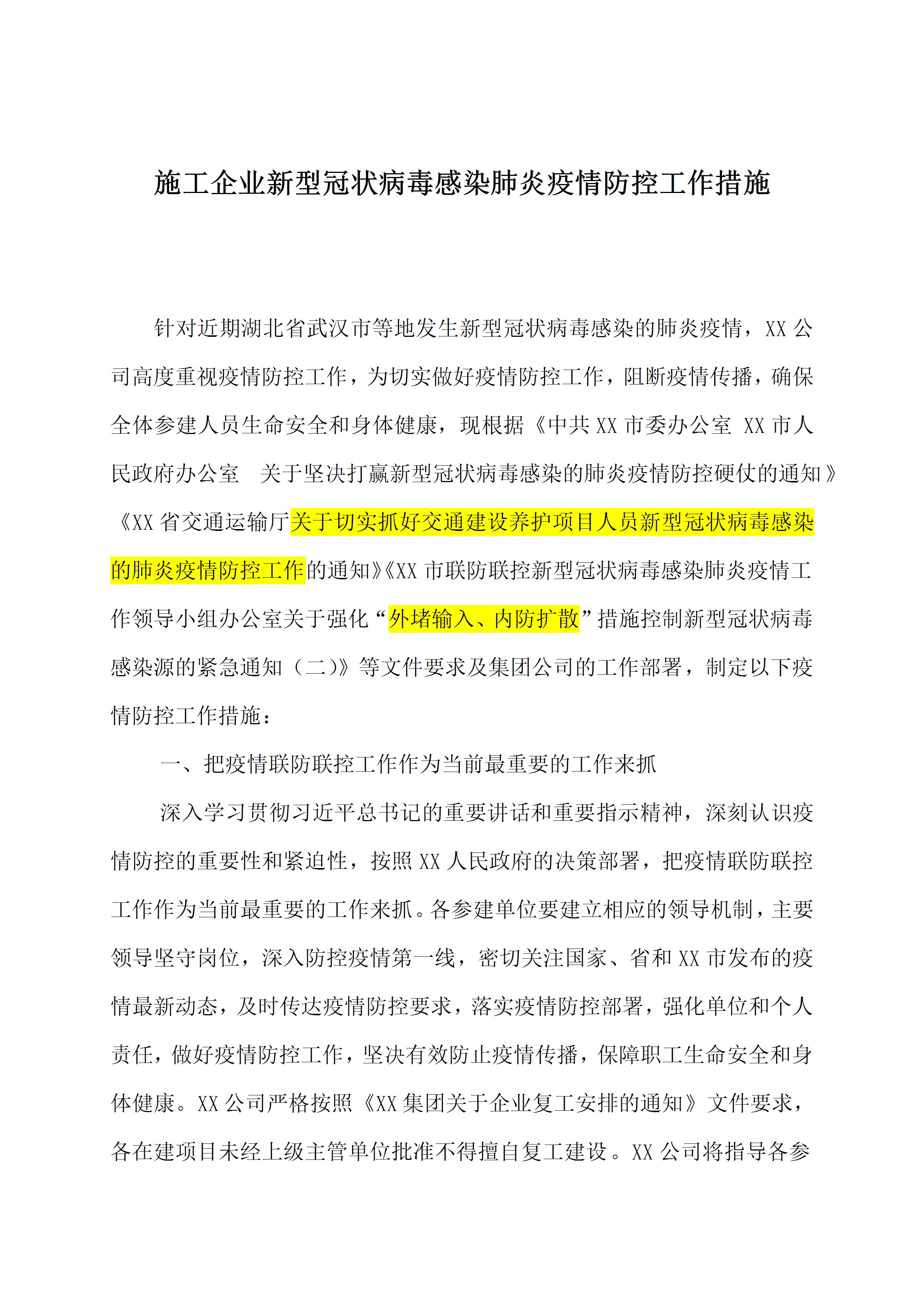 / 施工企业防控新型冠状病毒感染肺炎疫情工作措施[文档]