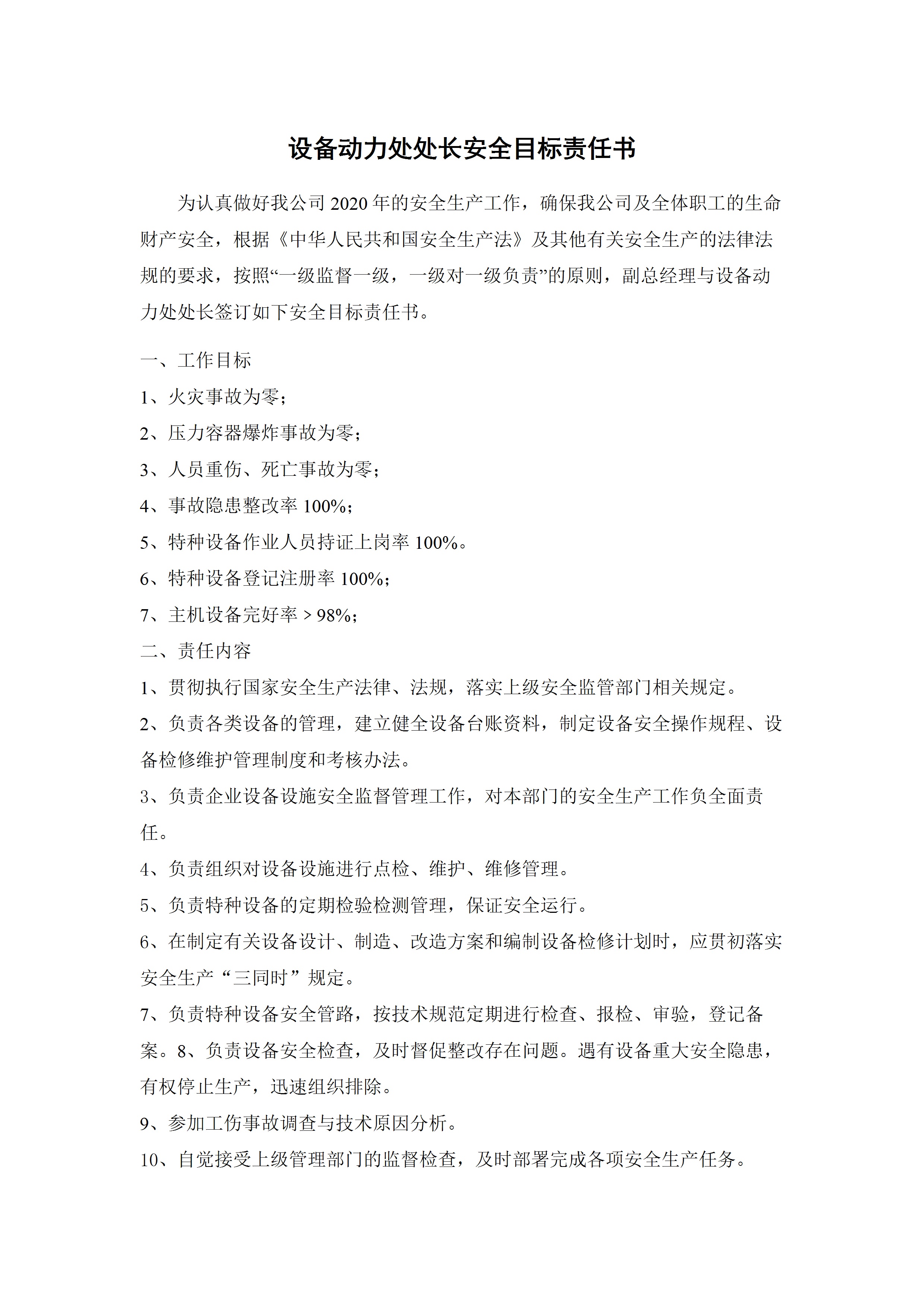 设备动力处处长安全目标责任书[文档]